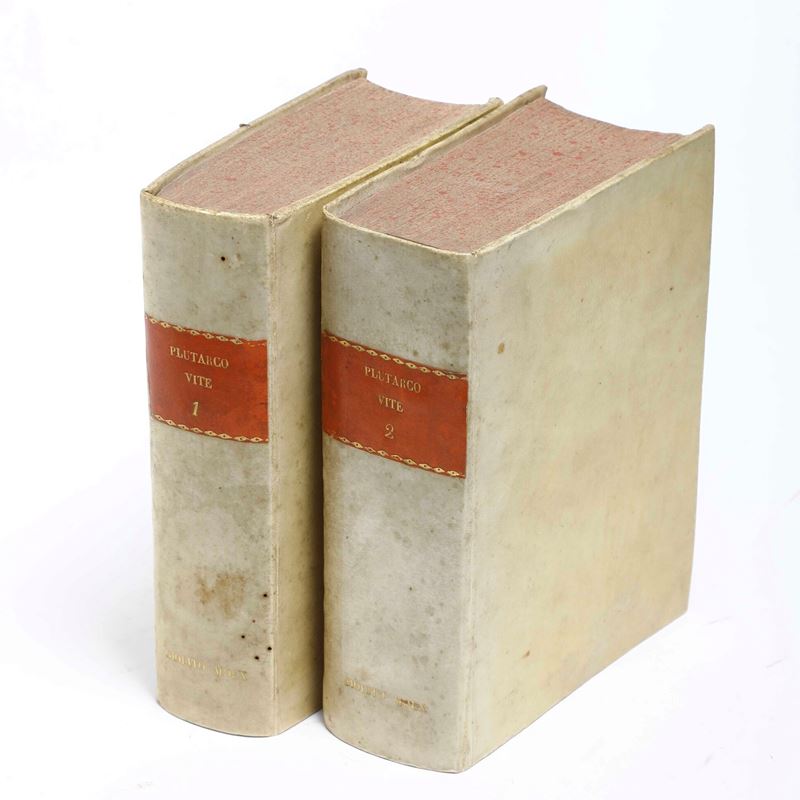 Due voll. in-4°. Il secondo legato con "Apostemmi di Plutarco. Motti arguti, piacevoli..", senza informazioni editoriali riportate. Rilegature in pergamena rigida moderna, taglia marezzati rossi. Bei frontespizi e iniziali silografiche. Esemplari in discrete condizioni, con qualche restauro, poche note manoscritte, qualche macchia e gallerie di tarlo per lo più marginali