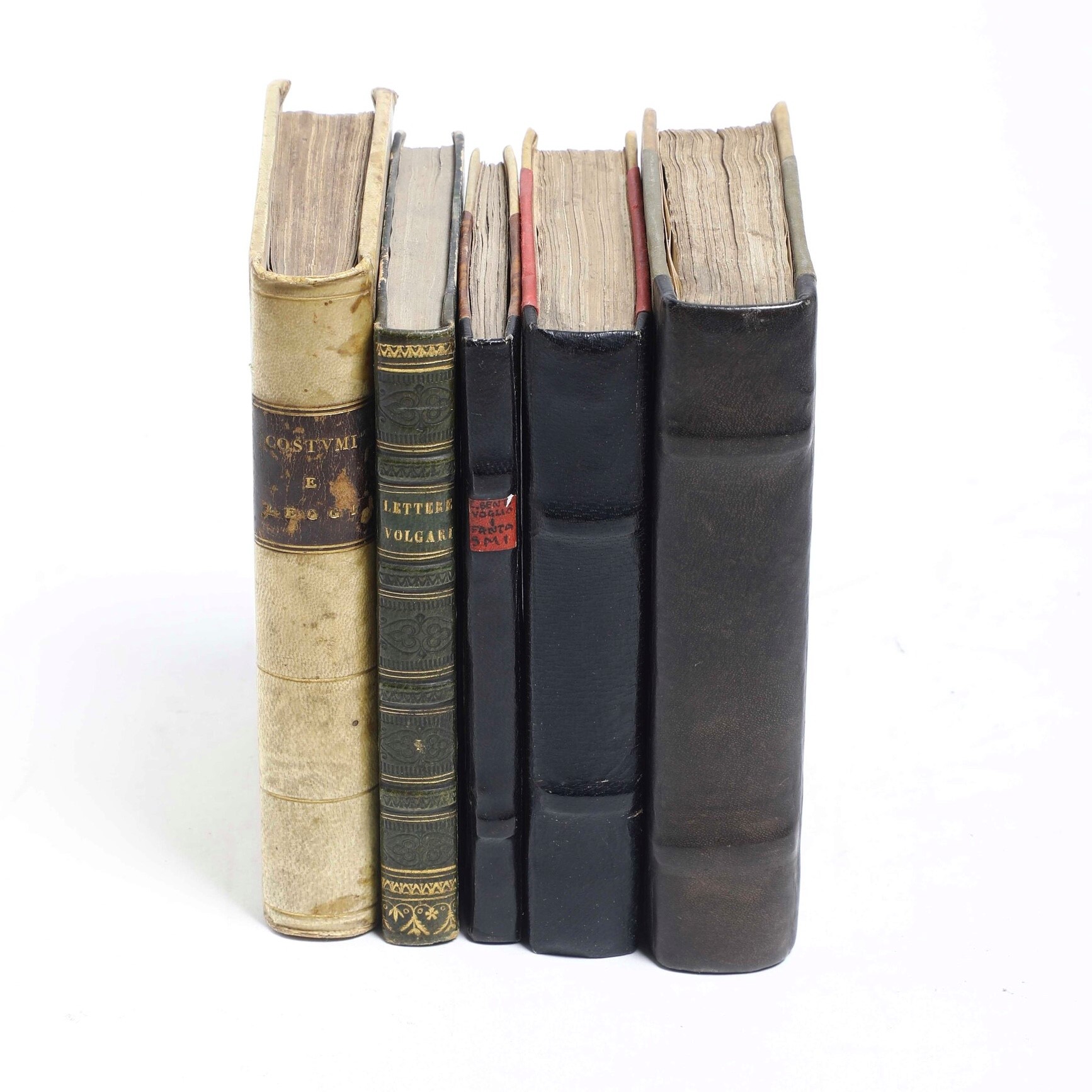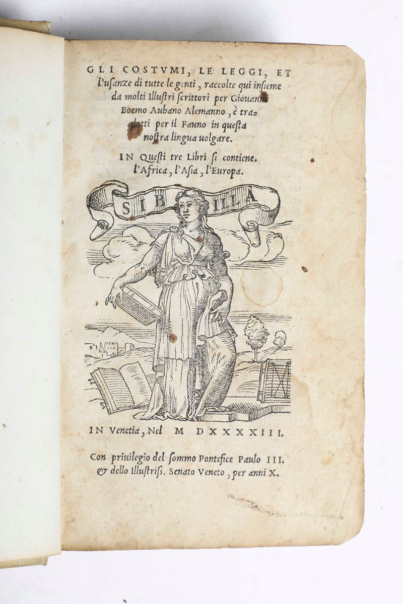 - Giovanni Boemo Aubano alemanno, Gli costumi, le leggi, et l'usanze di tutti le genti..In Venetia, per Michele Tramezino, 1543, In-8°. Rilegatura in pergamena rigida del secolo XIX. Qualche macchia e bruniture