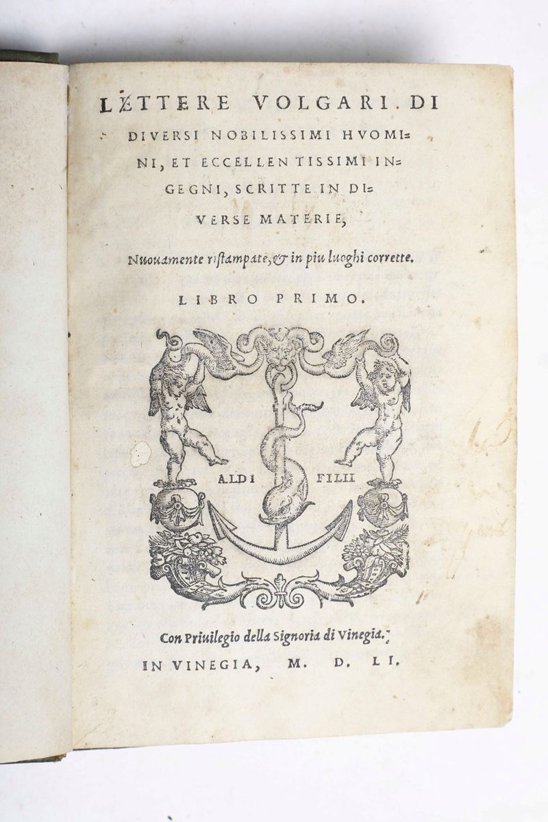 - Lettere volgari di diversi nobilissimi uomini..libro primo. In Vinegia, Aldi Filii, 1551. In-8°. Rilegatura in mezza pelle del secolo XIX. Foro di tarlo restaurato alle prime carte con minima perdita di testo, frontespizio leggermente brunito, esemplare fresco;