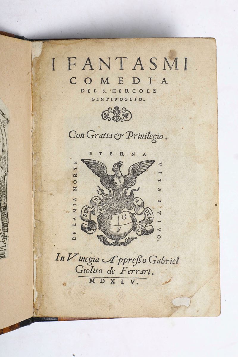 - Bentivoglio Hercole, I fantasmi, Comedia. In Vinegia, appresso Gabriel Giolito de Ferrari, 1545. In-8°. Rilegatura moderna in mezza pelle e punte in pergamena. Restauri al frontespizio, alcune illustrazioni silografiche aggiunte incollate su carta moderna, qualche macchia;