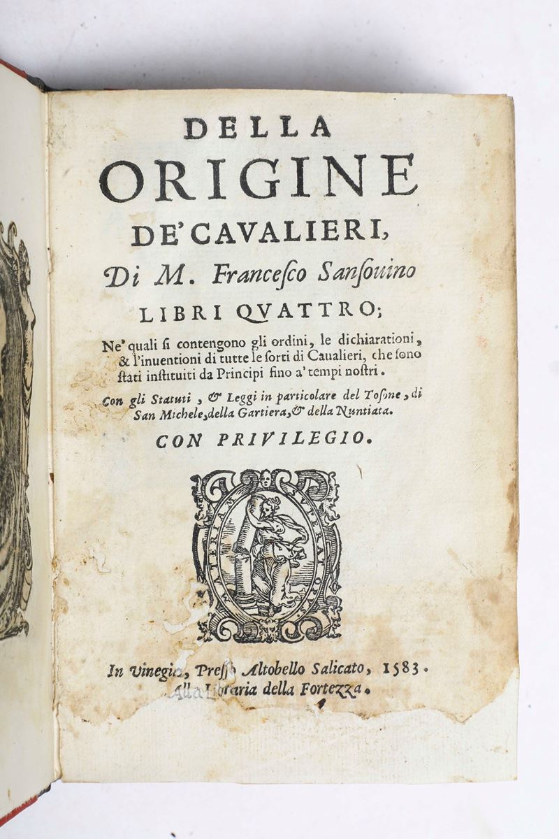 - Sansovino, Della origine de' cavalieri. In Vinegia, presso Altobello Salicato, 1583. In-8°. Rilegatura moderna in mezza pelle e punte in pergamena. Esemplare fresco, con qualche macchia;