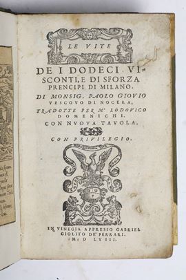 - Giovio Paolo, Le vite de i dodici Visconti, e di Sforza prencipi di Milano. In Vinegia, appresso Gabriel Giolito de' Ferrari, 1558. In-8°. Rilegatura moderna in mezza pelle e punte in pergamena. Alcuni piccoli restauri ma esemplare complessivamente fresco;