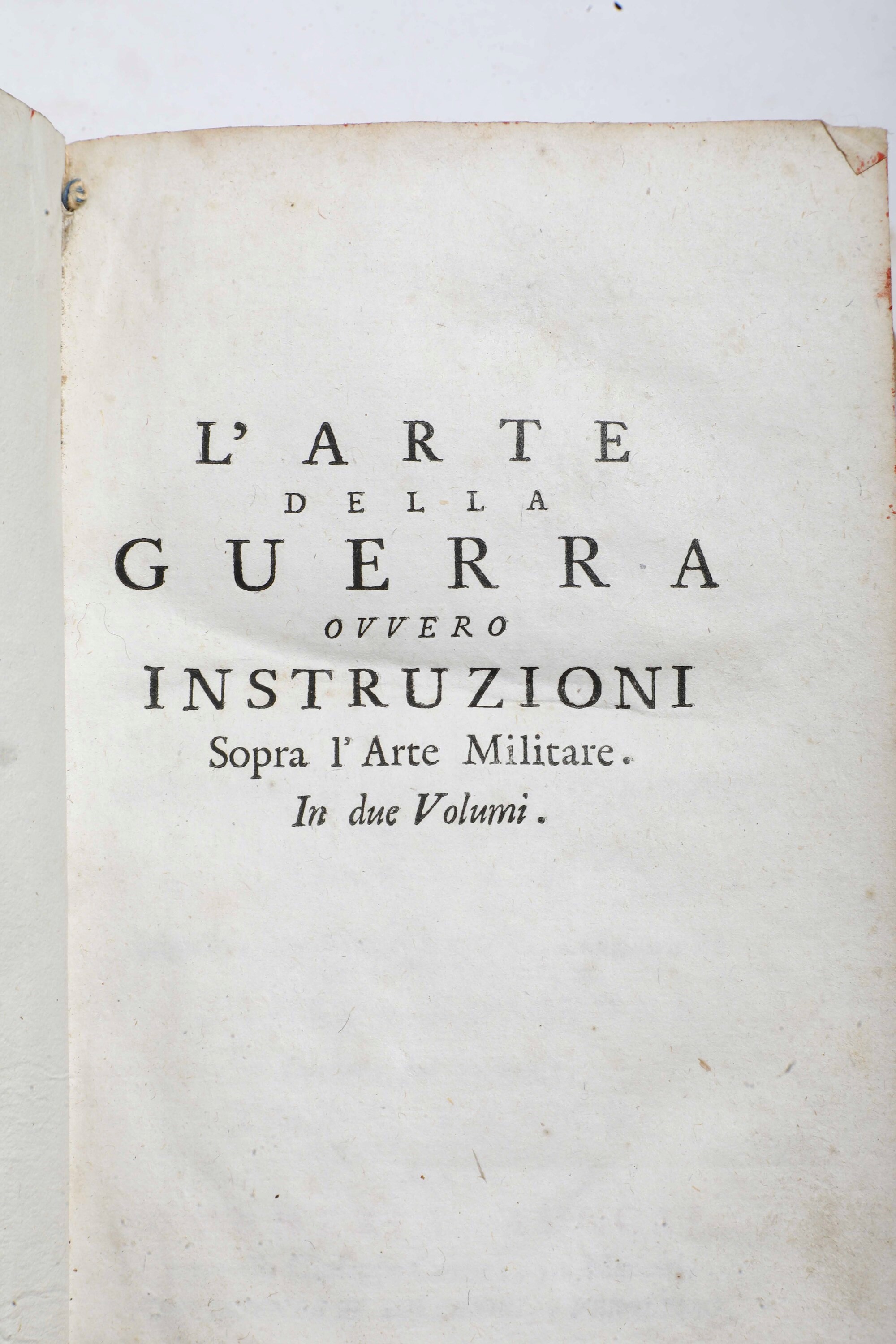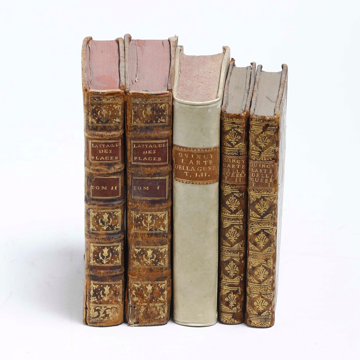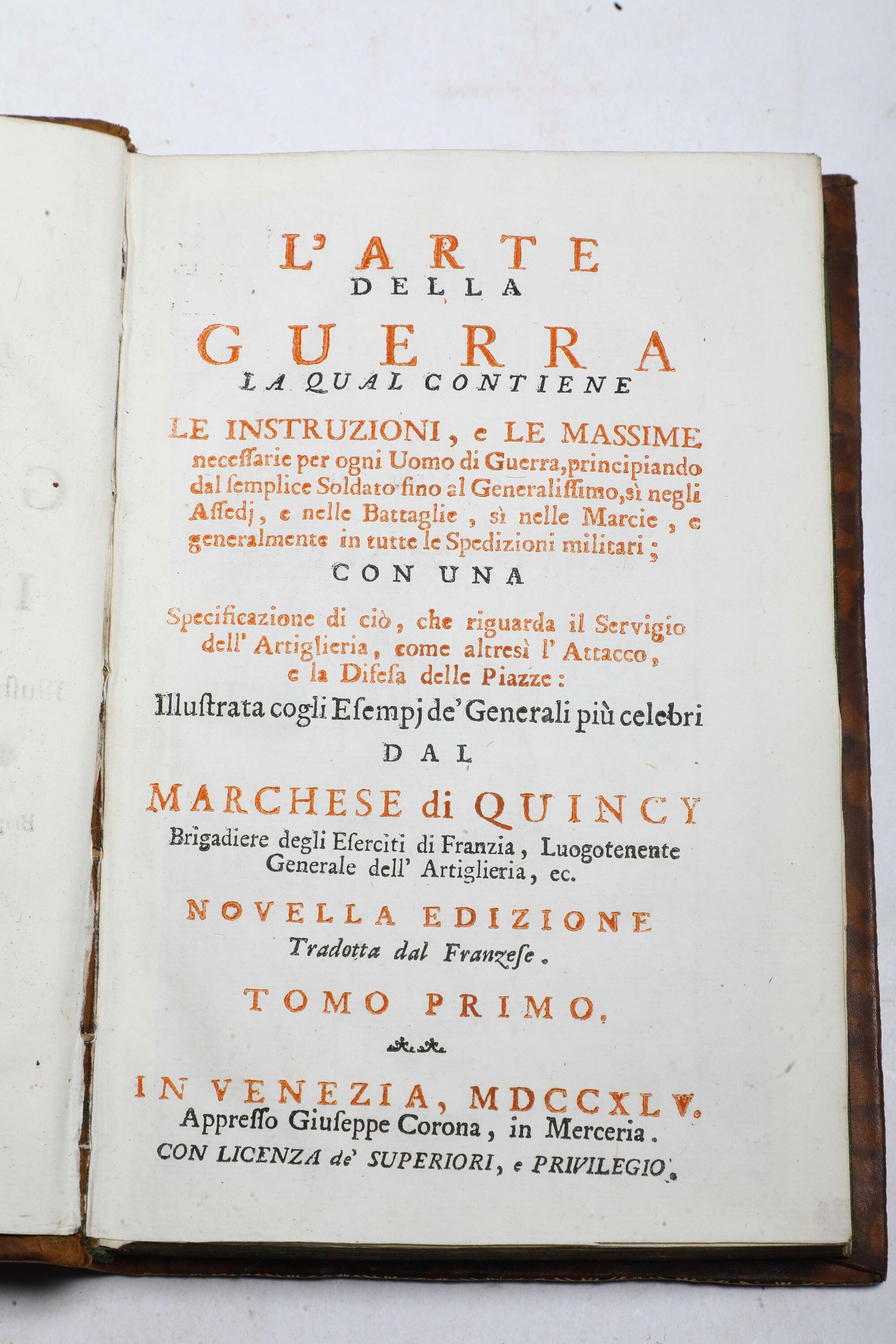 - Sevin Charles, Marchese di Quincy, L'arte della guerra, In Venezia, appresso Giuseppe Corona, 1745. Due voll. in-8°. (mm 172x110). Rilegature coeve in piena pelle con cornici impresse in oro, taglio dorati Belle tavole esplicative nel testo.