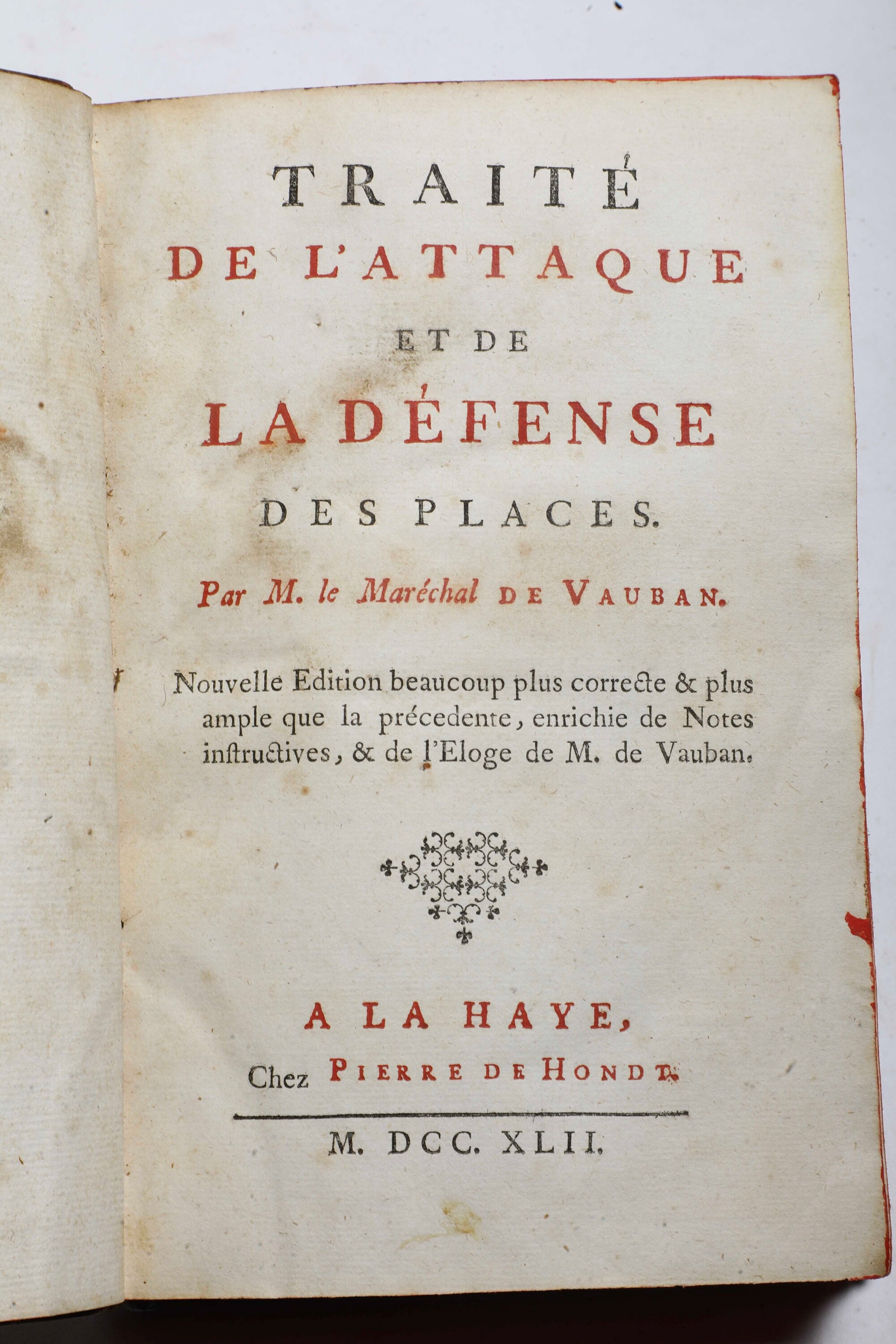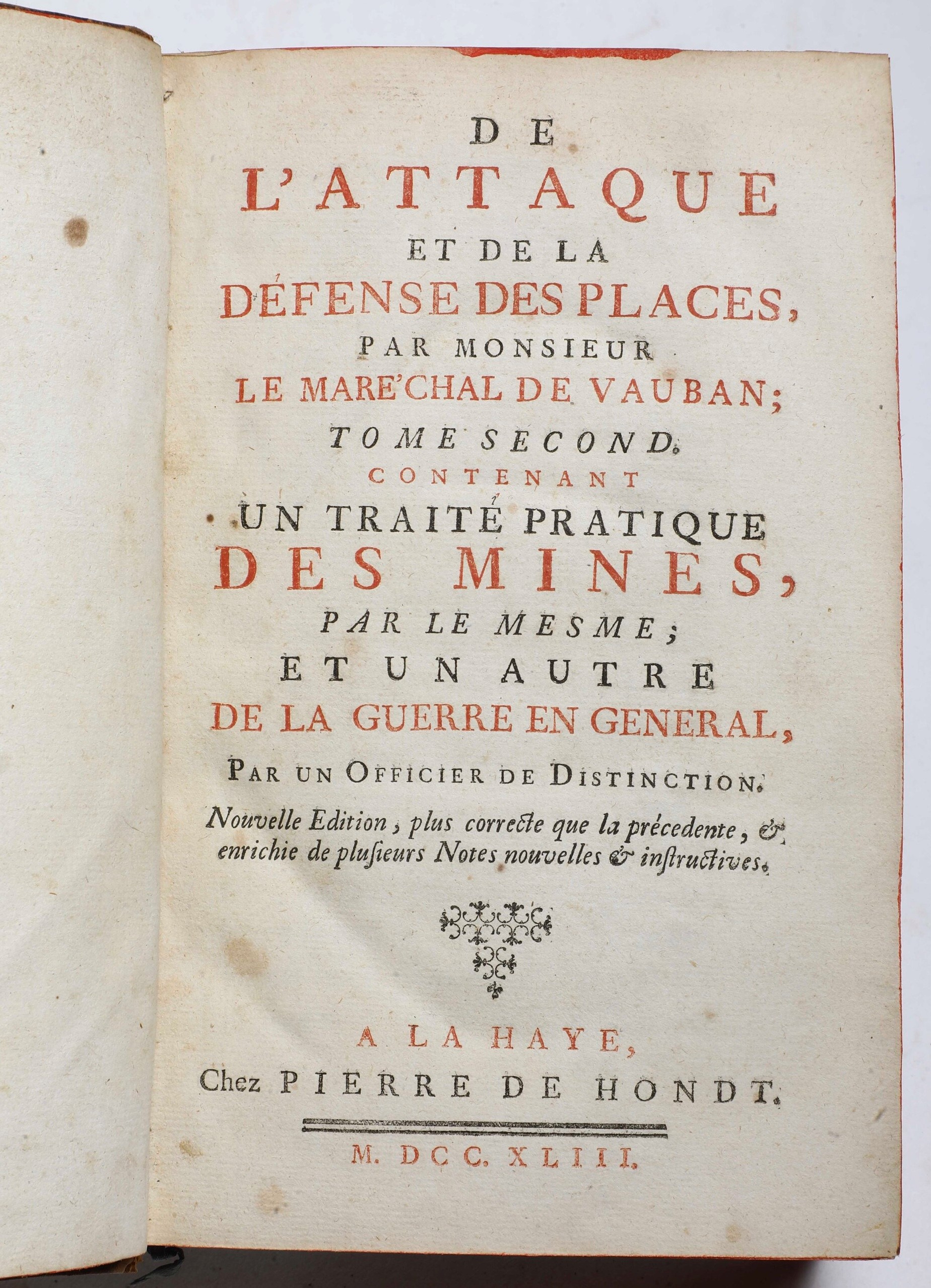 - Marechal De Vauban, Traité del l'Attaque et de la defence des places.., A La Haye, chez Pierre de Hondt, 1742. In-8° (191x121). Rilegatura coeva in piena pelle (usure). Belle tavole più volte ripiegate al termine del volume.