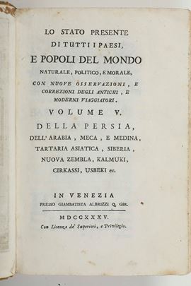 Salmon Thomas (1679-1767) Della Persia, Arabia, Tararia, ecc... volume V (parte dell’opera "Lo stato presente di tutti i paesi e i popoli del mondo"...