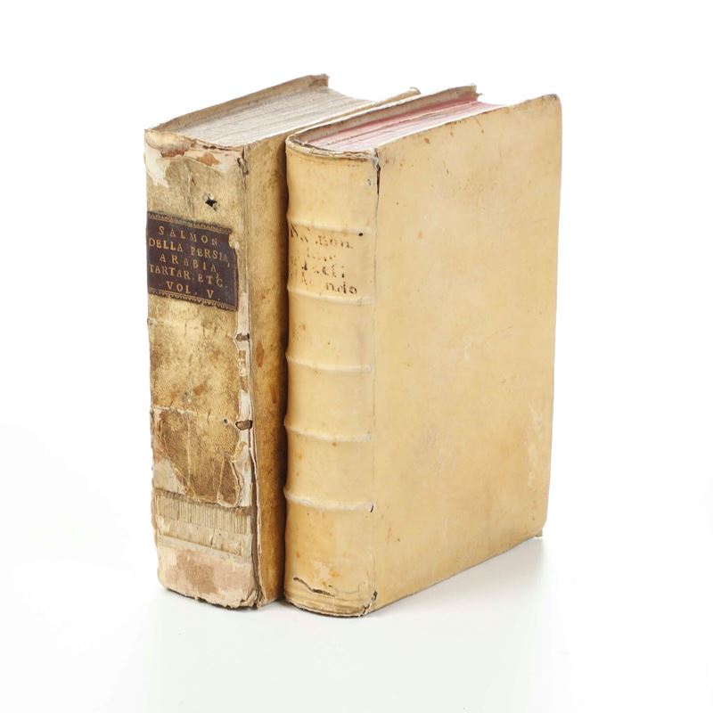 In-4°. Si propongono nel lotto due esemplari, entrambi rilegati in piena pergamena. Alcune tavole mancanti e altri difetti. Proposti come collezione di stampe