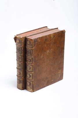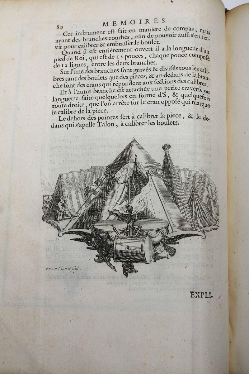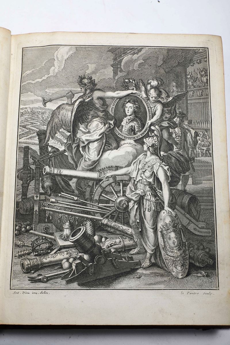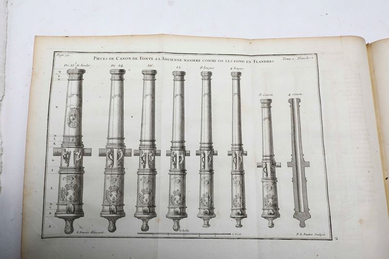 Due voll. in-4°. (mm 256x191). Rilegature coeva in piena pelle, tagli rossi (usure, piccola mancanze e rotture). Dopo l'antiporta del primo volume allegoria militare e ritratto dell'autore, entrambi a tutta pagina, numerose belle tavole fuori testo, molte più volte ripiegate, raffiguranti, arsenali, forti, armi. Esemplare fresco, una carta al volume II staccata