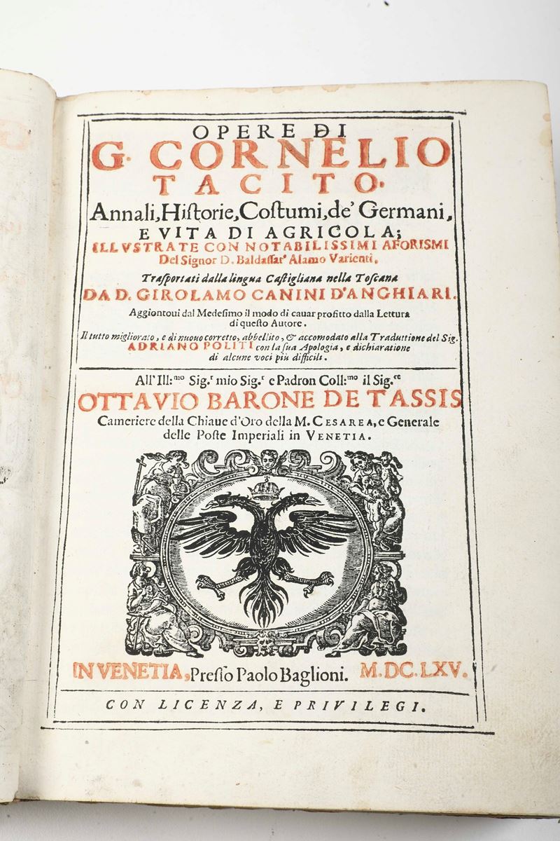 Tacito Publio Cornelio (Gaio) (55-117 d.C.) Opere..Annali, Historia, Costumi de' Germani, Vita di Agricola.. In Venetia, [..]