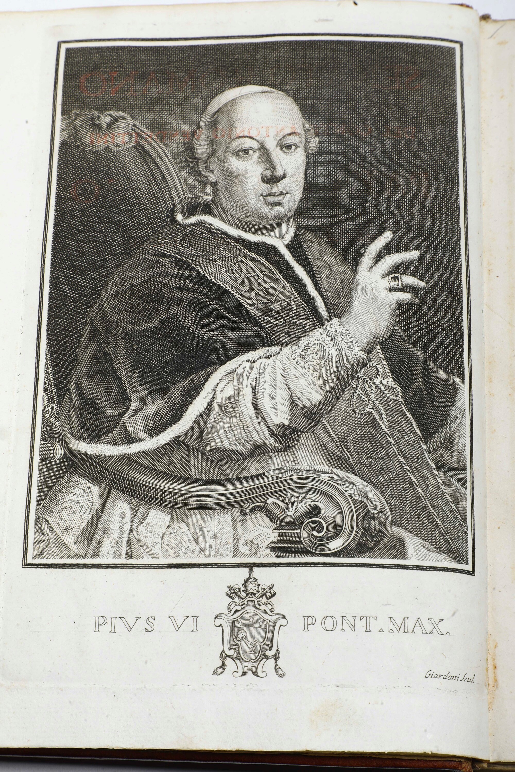 In-4°. Bella rilegatura papale alle armi di papa Pio VI Braschi. Restauro al frontespizio peraltro esemplare fresco.