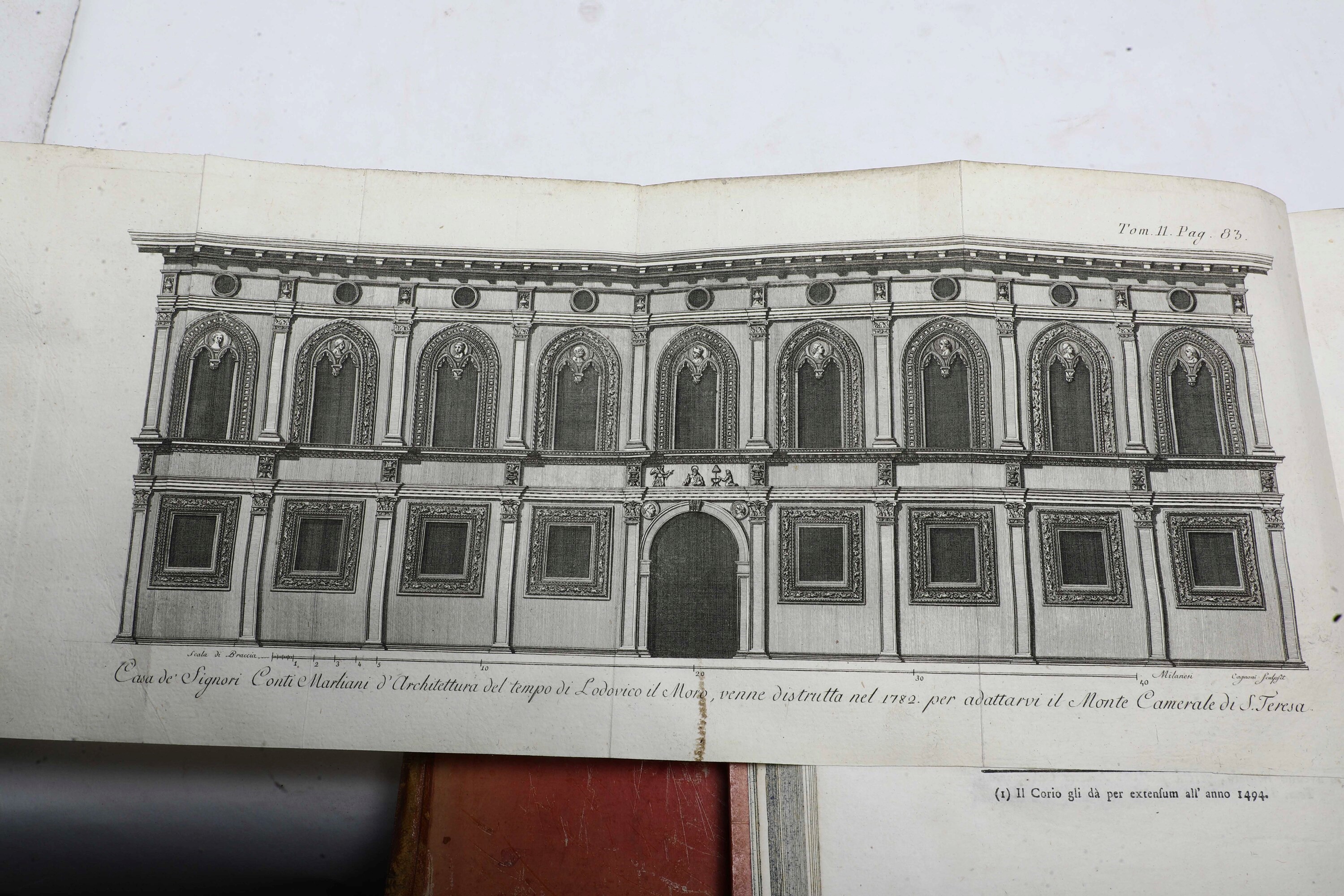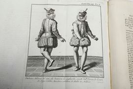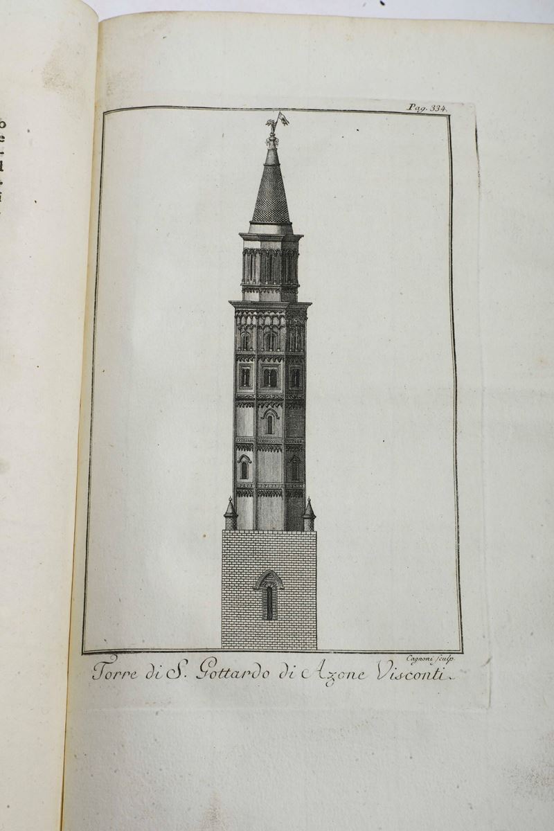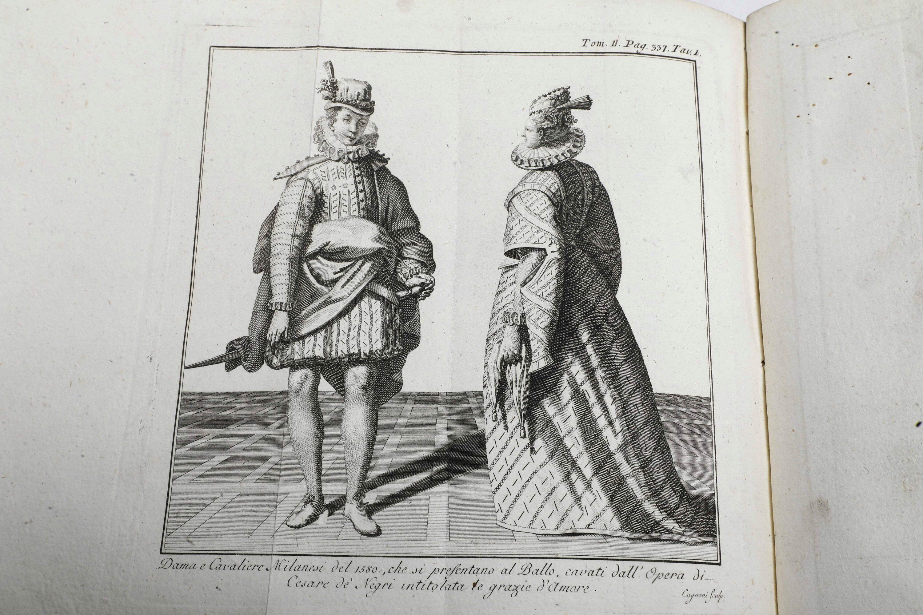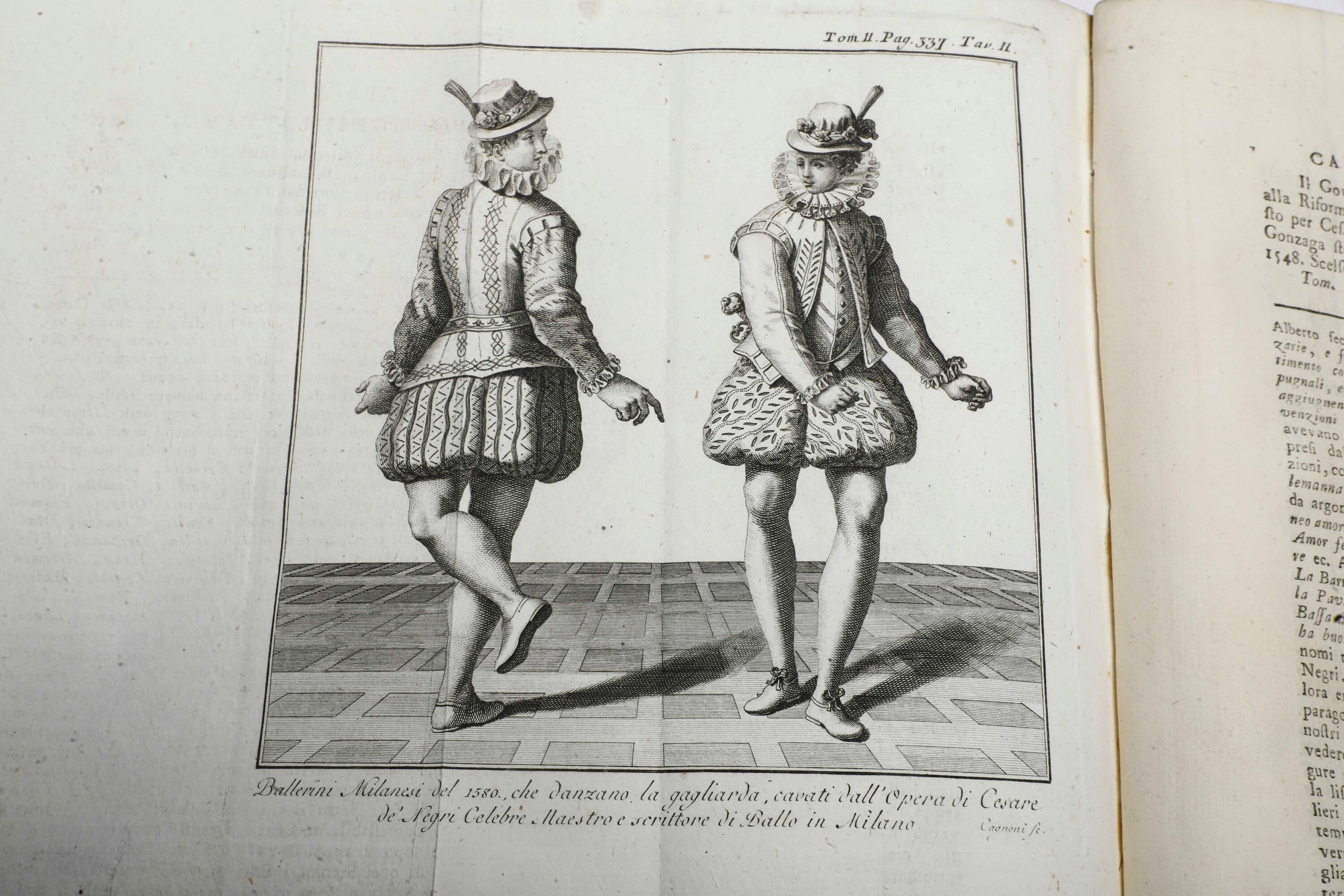 In-4°. Due volumi, rilegature coeve in mezza pelle che presentano alcune abrasioni. Esemplare bello, fresco e marginoso. Primo volume: contiene pianta della città di Milano e altre tre tavole fuori testo più un albero genealogico. Il volume secondo contiene tre tavole fuori testo compresa quella celebre, raffigurante i ballerini milanesi.