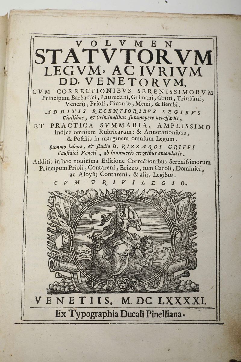 Volumen Statutorum Legum, ac Iurium Dd. Venetorum Venetiis, ex typographia Ducali Pinelliana, 1691