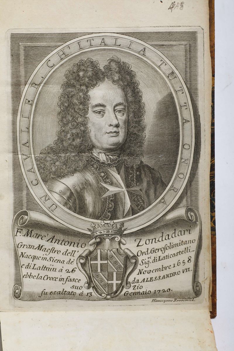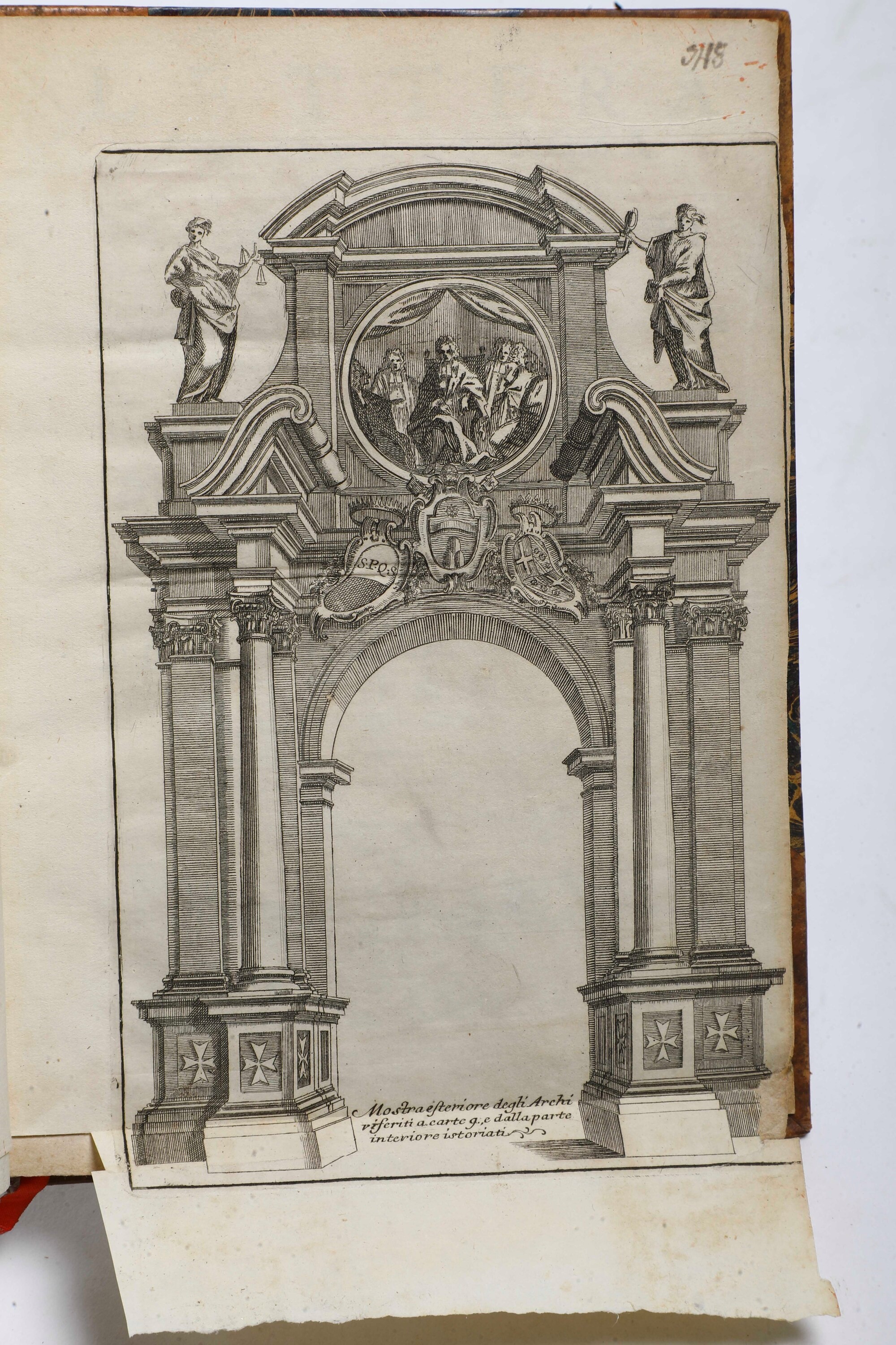 In-4°. (mm 203x145). Rilegatura del XIX secolo in mezza pelle e punte, ex libris nobiliare al contropiatto anteriore (piccole fessurazioni alle cerniere). Prima del frontespizio due tavole a tutta pagina con ritratto dell'autore e arco trionfale. Esemplare un po' corto di margini e un po' brunito ma in più che discrete condizioni