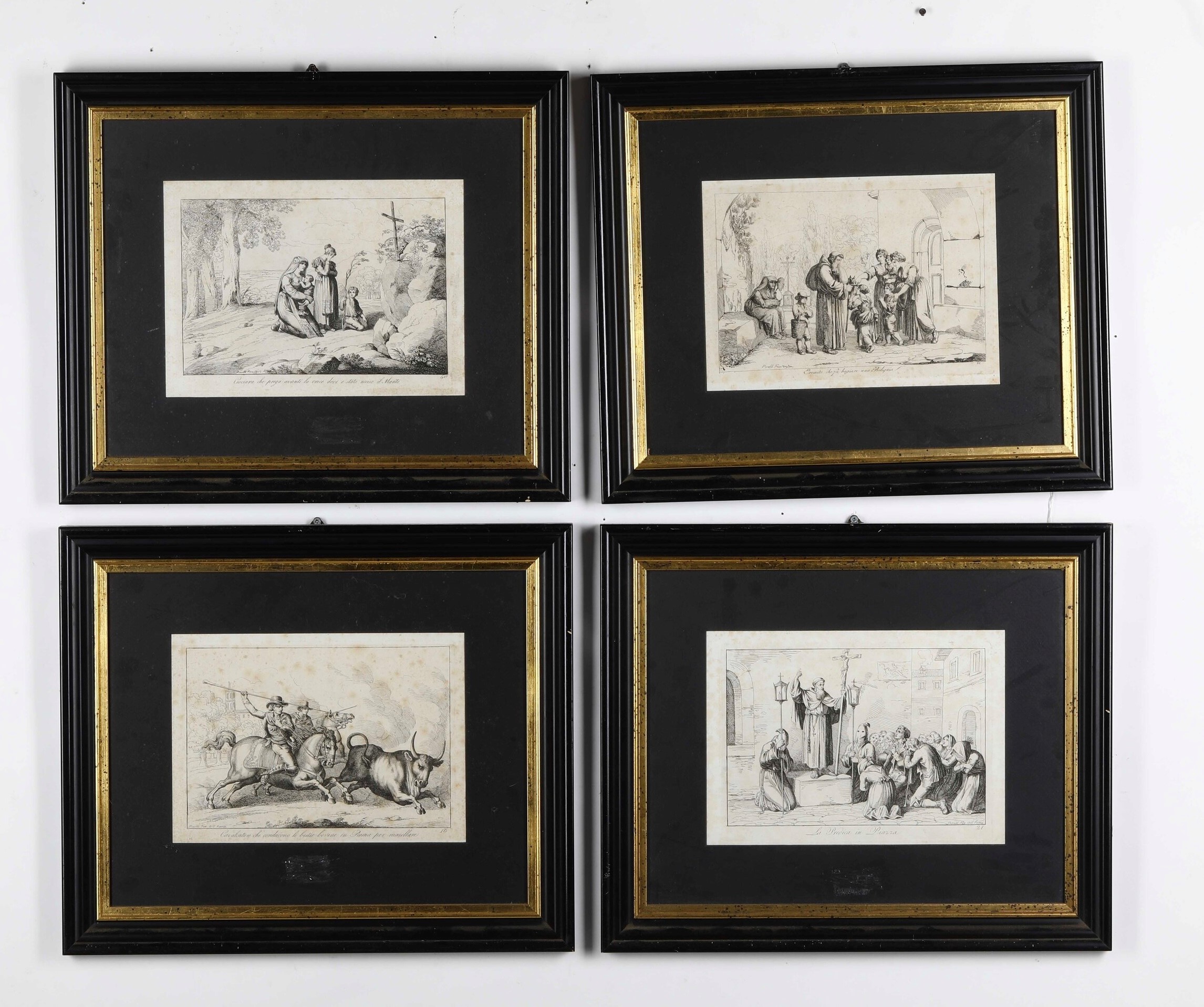 Acqueforti. Buone impressioni marginose. Gruppo di quattro scene di genere, presumibilmente tratte dalla "Raccolta di costumi pittoreschi" edita in Roma nel 1816. Entro cornici.