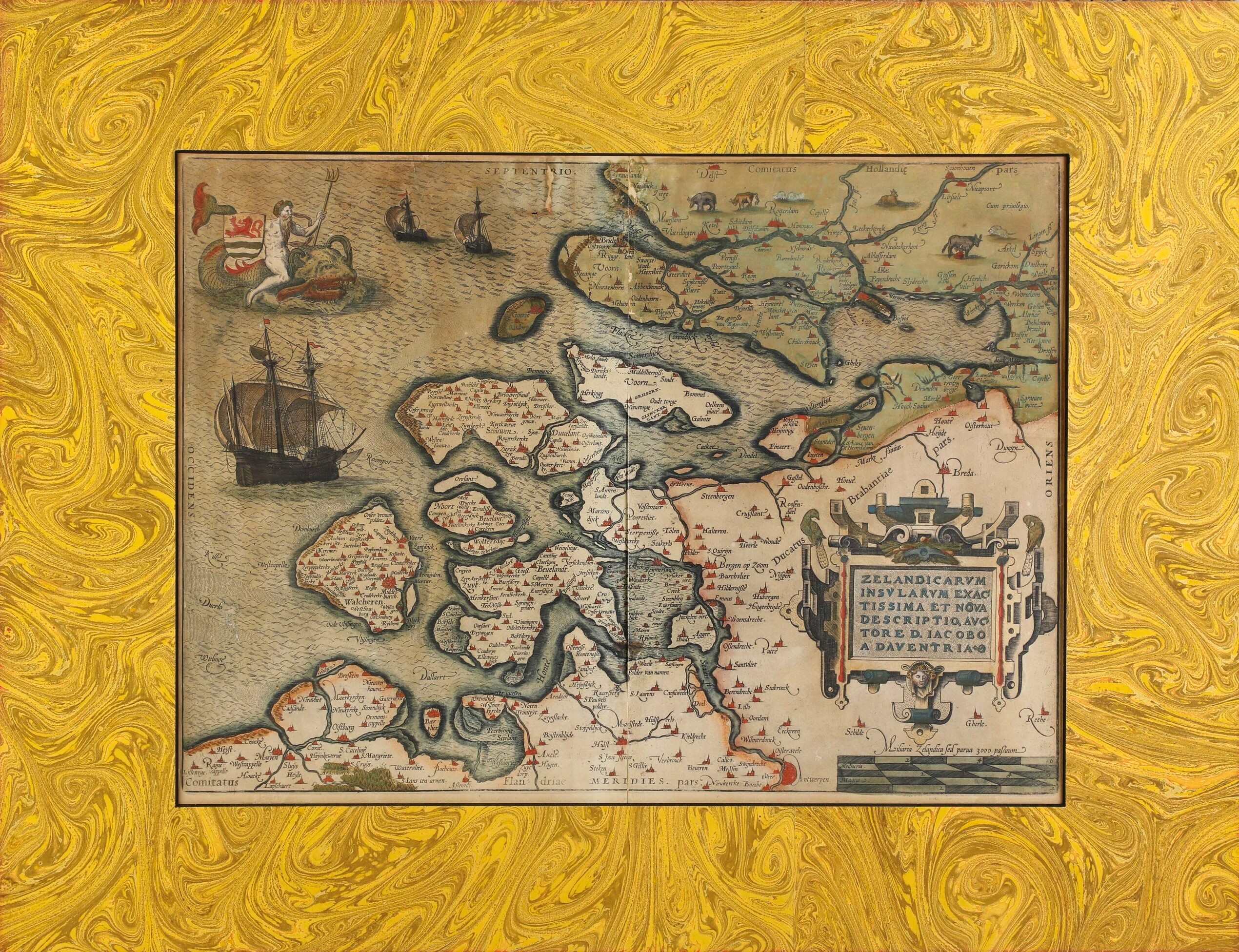 Incisione su rame colorata ad acquarello, tratta dal volume "Zelandicarum Insularum Exactissima Et Nova Descriptio" del cartografo olandese Jacob van Deventer, edita per la prima volta nel 1580. Due fogli uniti. Dim. rame cm 34,5x46,5, dim. totale fogli cm 40x53