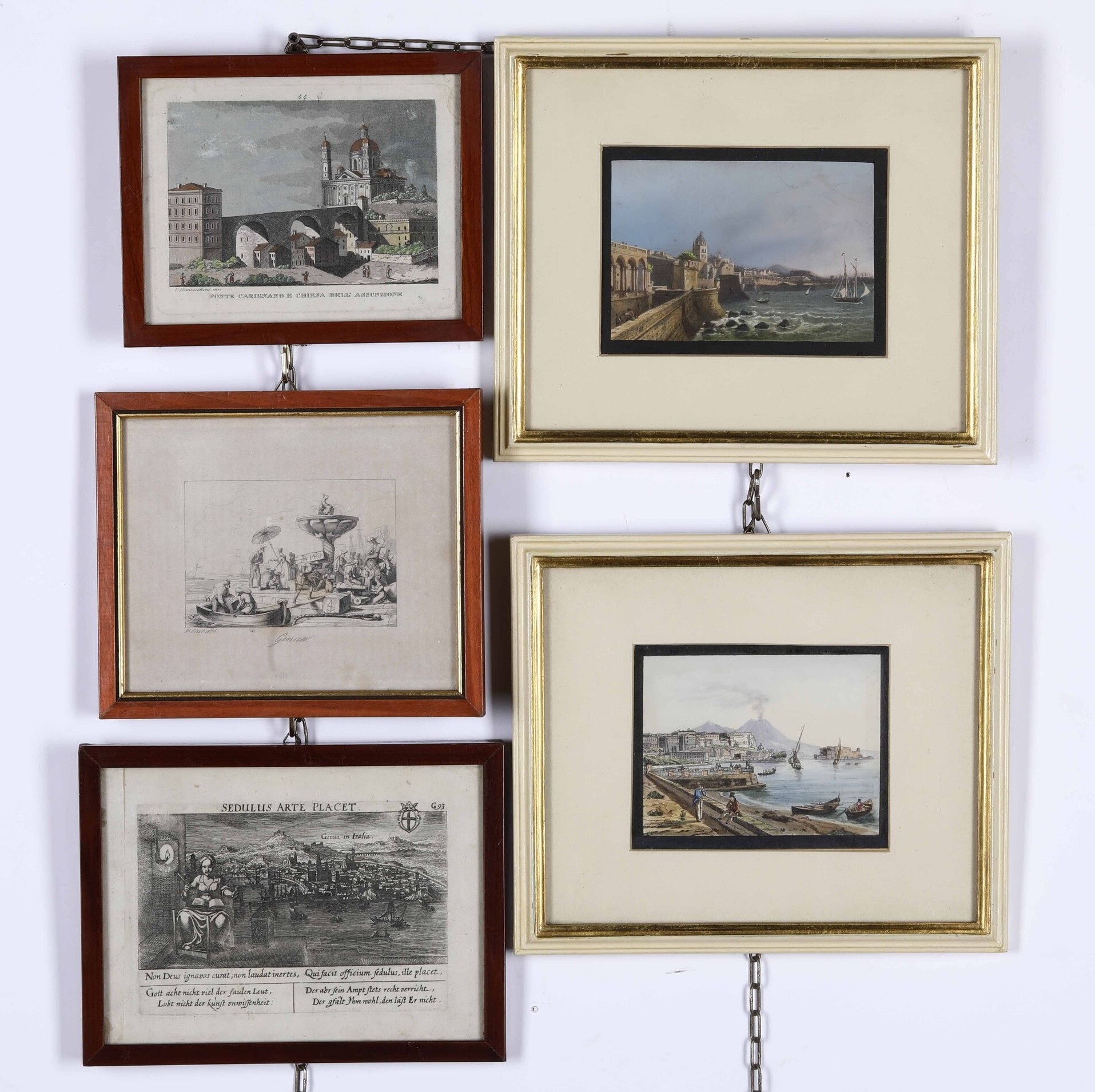 Genova, Napoli ed altro Lotto composito di 5 piccole incisioni incorniciate, una patente notarile e un privilegio notarile [..]