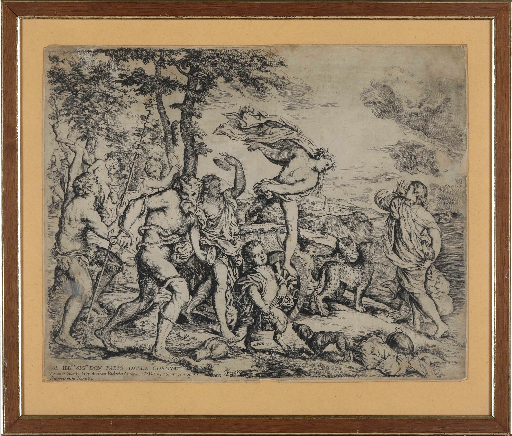 Stampa su rame. Impressione frasca, foglio poco marginoso. Bella riproduzione del celebre dipinto realizzato da Tiziano per il camerino di Alfonso I d'Este nel Castello di Ferrara. Entro cornice.