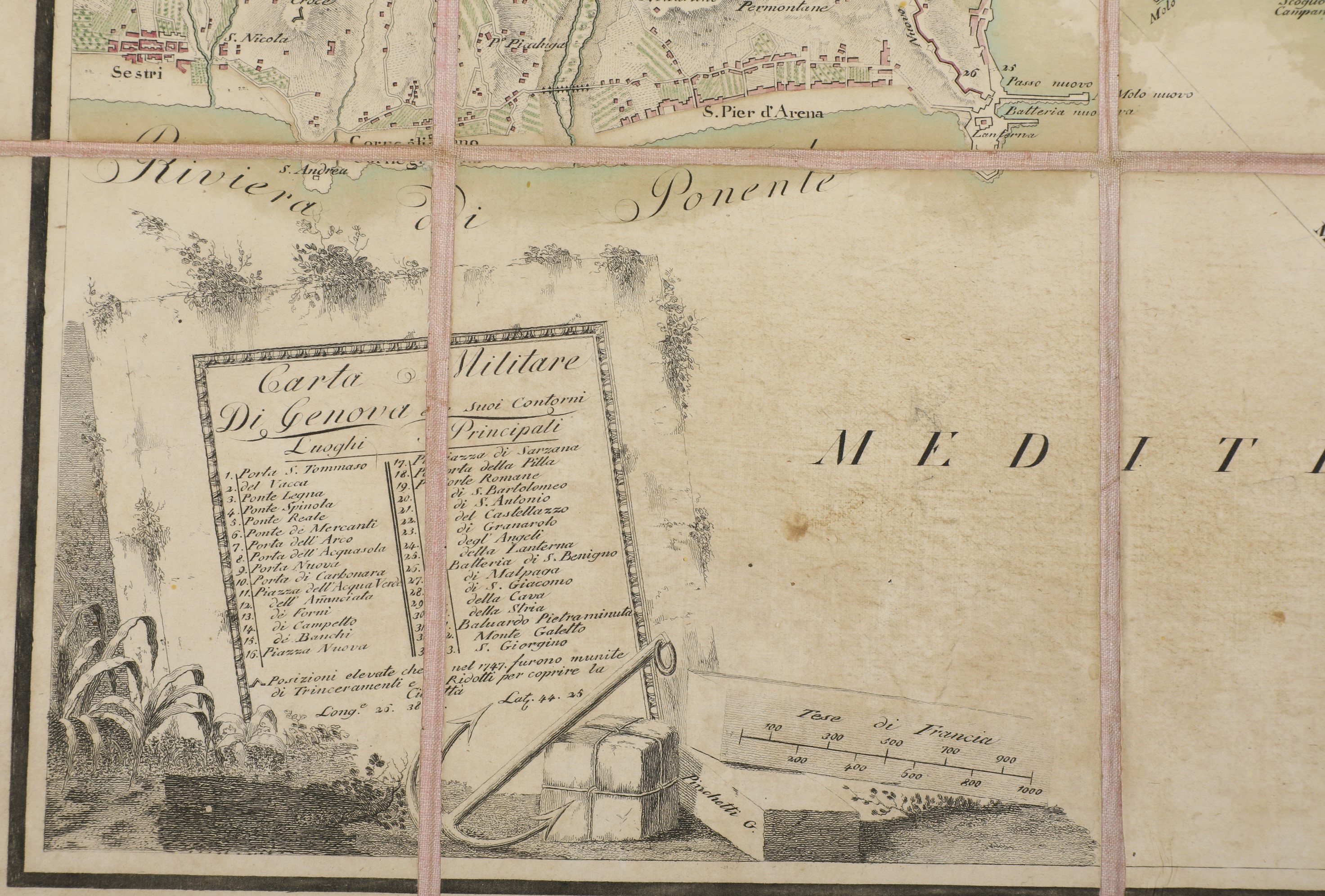 Rarissima carta militare incisa in rame. 12 fogli montati su tela. Dimensione totale carta cm 64,5x54,5. Bella carta in piacevole coloritura che mette in risalto le posizioni di trinceramento consolidate nel 1747.