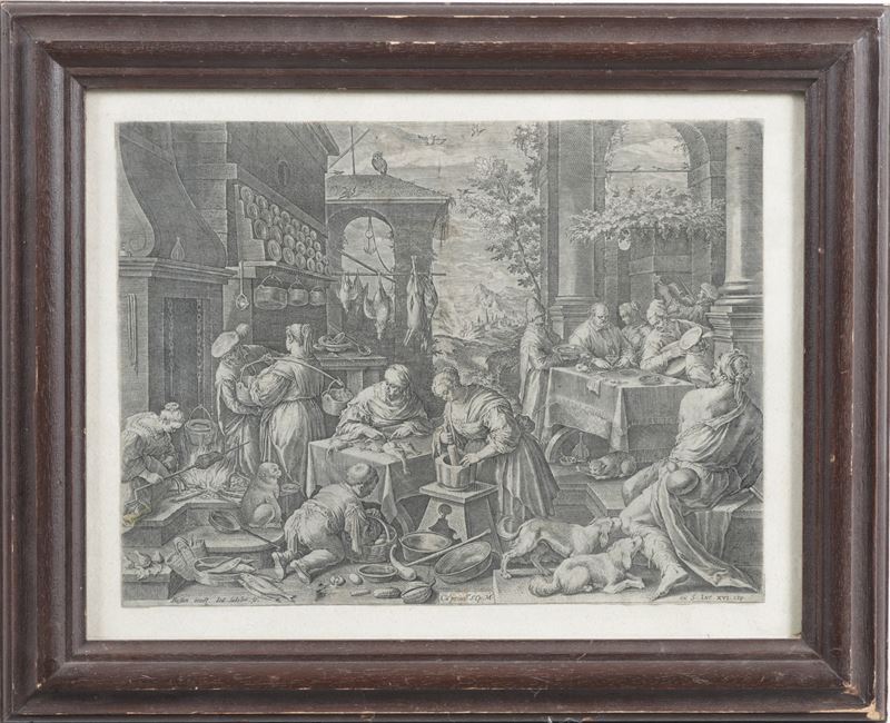 Johannes Sadeler (Bruxelles 1550 - Venezia 1600) Lazzaro alla mensa del ricco Epulone