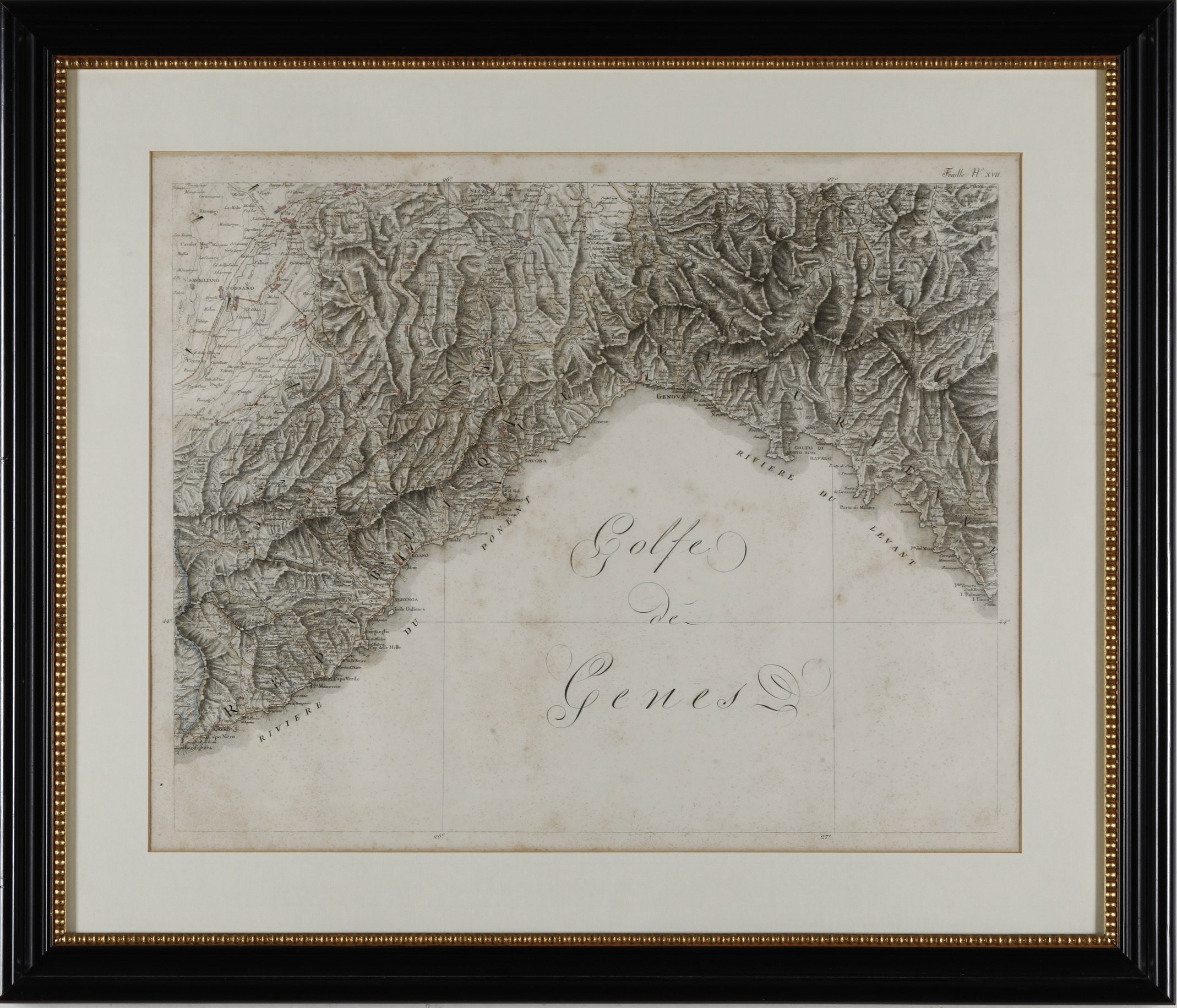 Incisione su rame. Bella carta geografica tratta dalla "Carte générale du Théâtre de la Guerre en Italie ...", Parigi, chez l’Auteur, 1798. Entro cornice. Dimensioni: 68x55 cm