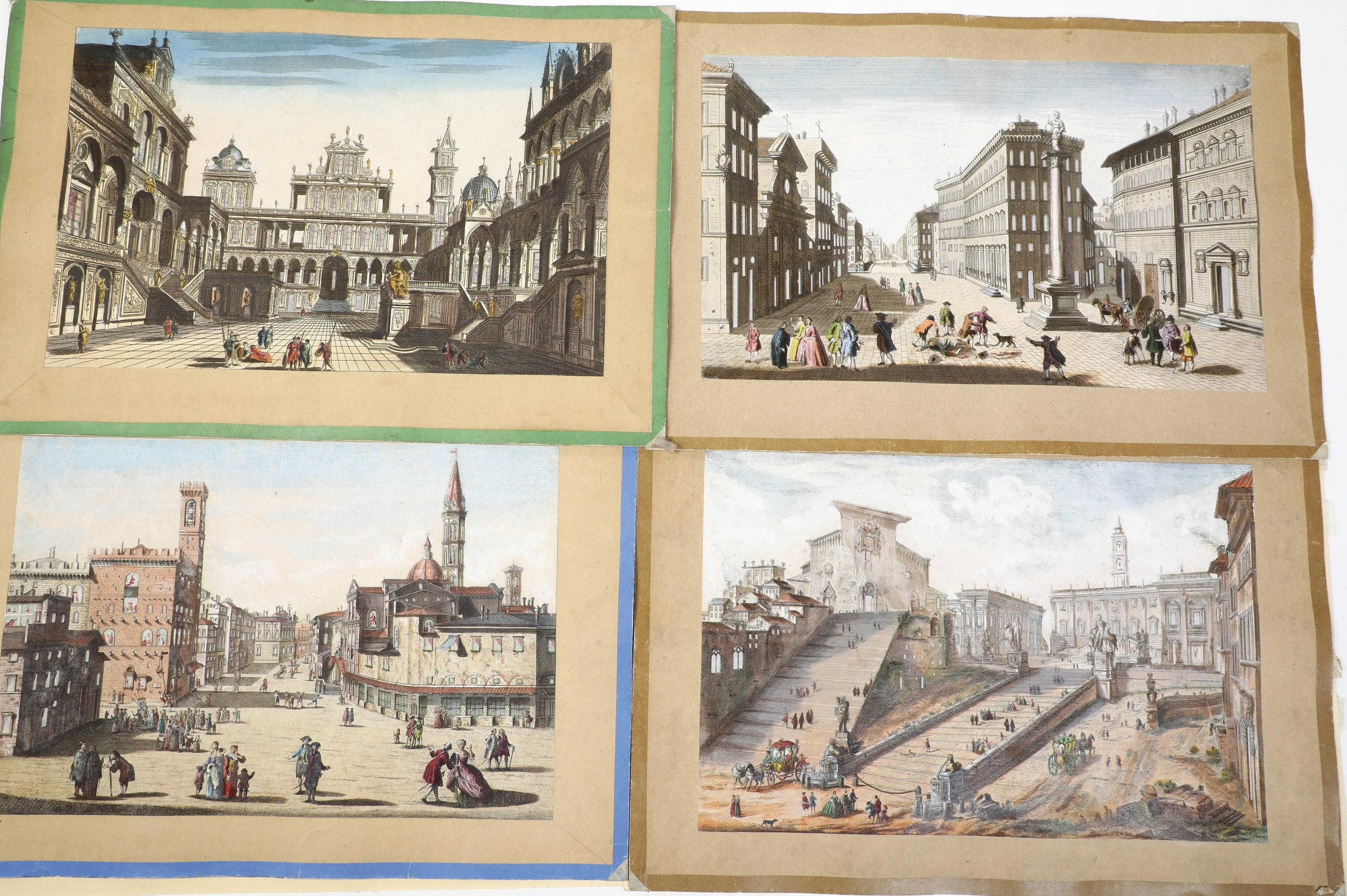 Mondo nuovo-quattro stampe traforate a colori. Roma, les escalier de l'eglise da Ara Caeli; Firenze, L'eglise et le Pont de la Trinitè; Firenze, la prevaute et le palè du grand magistere; Superbe edifice de fantasie.