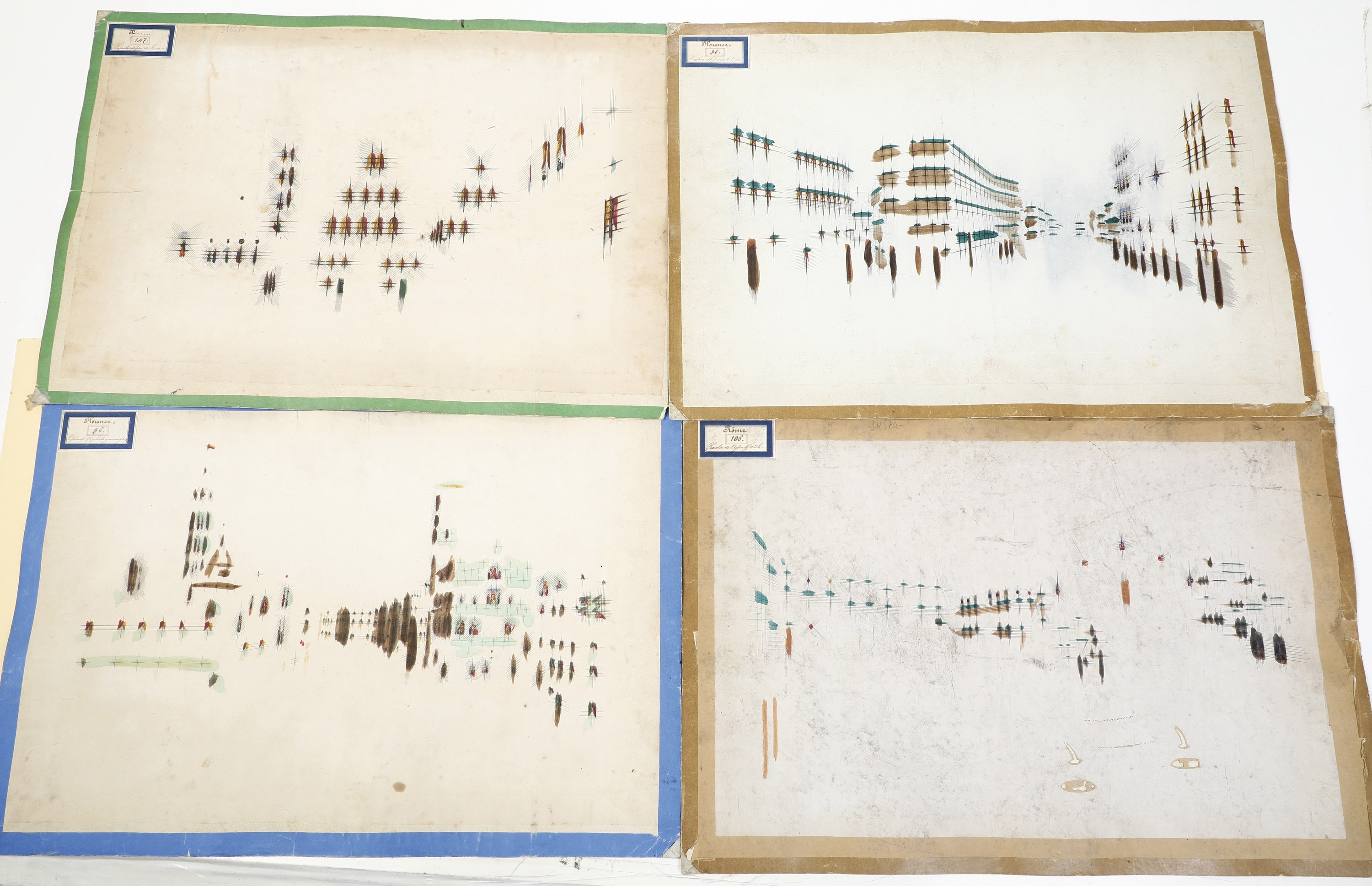 Quattro belle incisioni traforate e in bella coloritura applicate su cartoncino, del secolo XVIII, presumibilmente di produzione francese o di aria veneta, prodotte per il mercato del Grand Tour e pensate per essere proiettate nel "Mondo Nuovo". Dimensioni: 40x26 cm