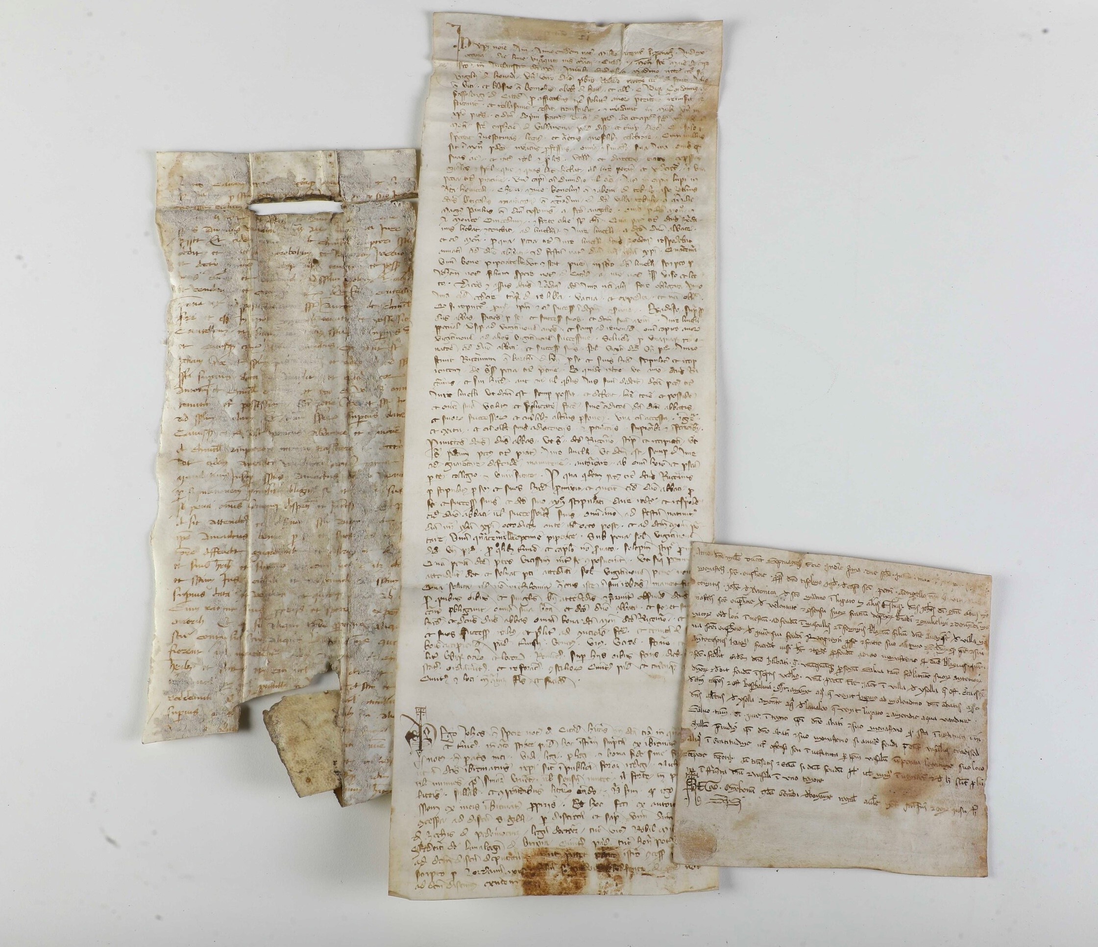 Tre pagine manoscritte su pergamene, del XIII-XIV secolo