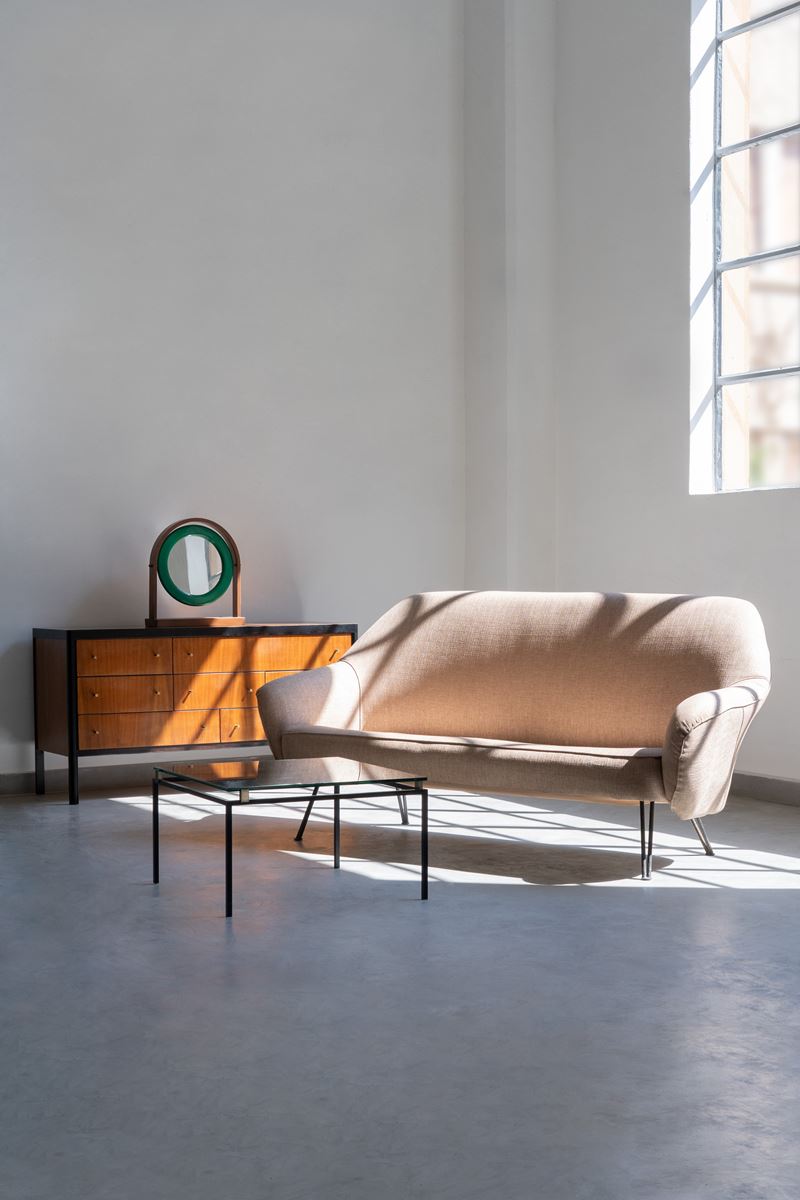 Struttura in legno e sostegni in legno laccato. Maniglie in ottone.