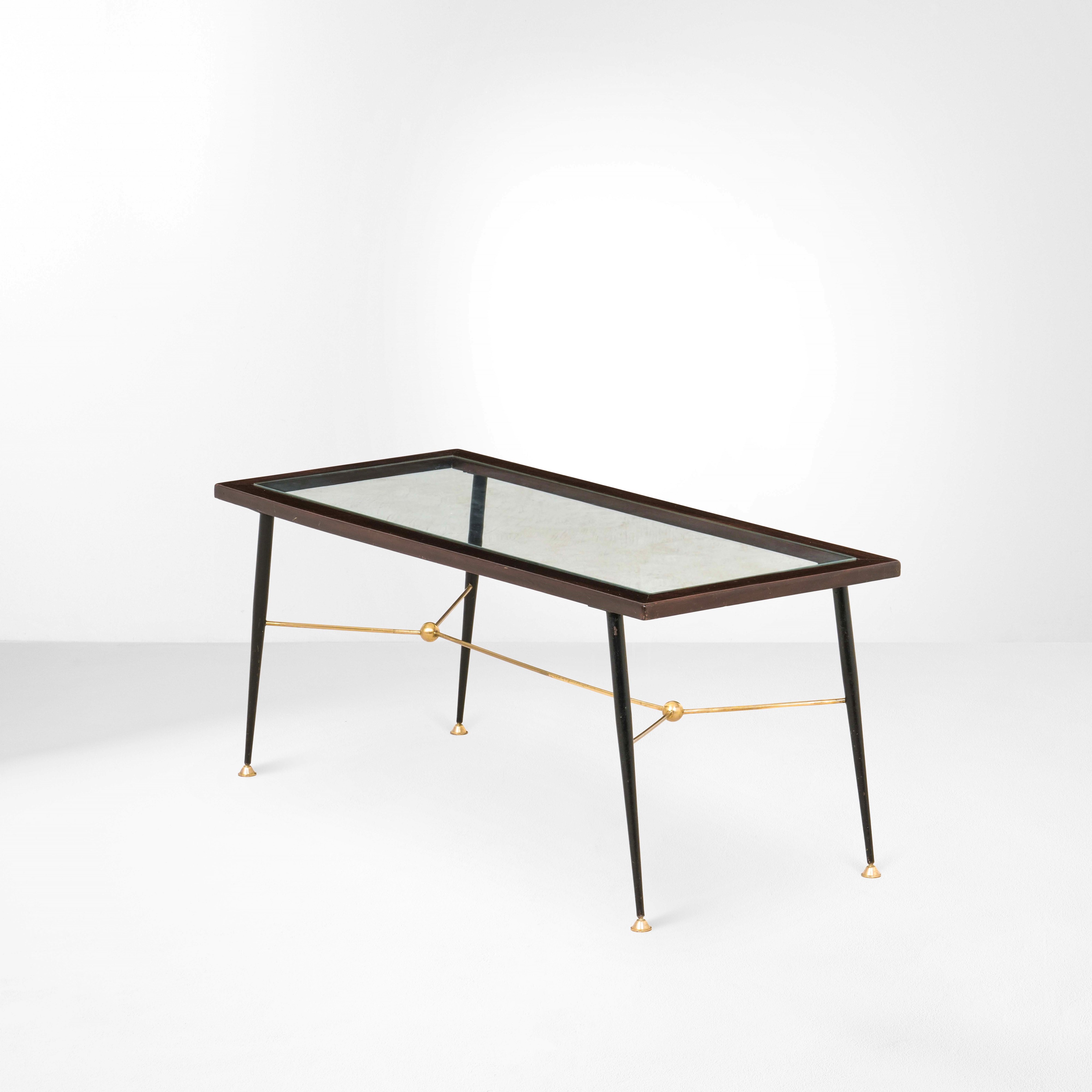 Struttura in legno, metallo laccato e ottone, piano in cristallo.