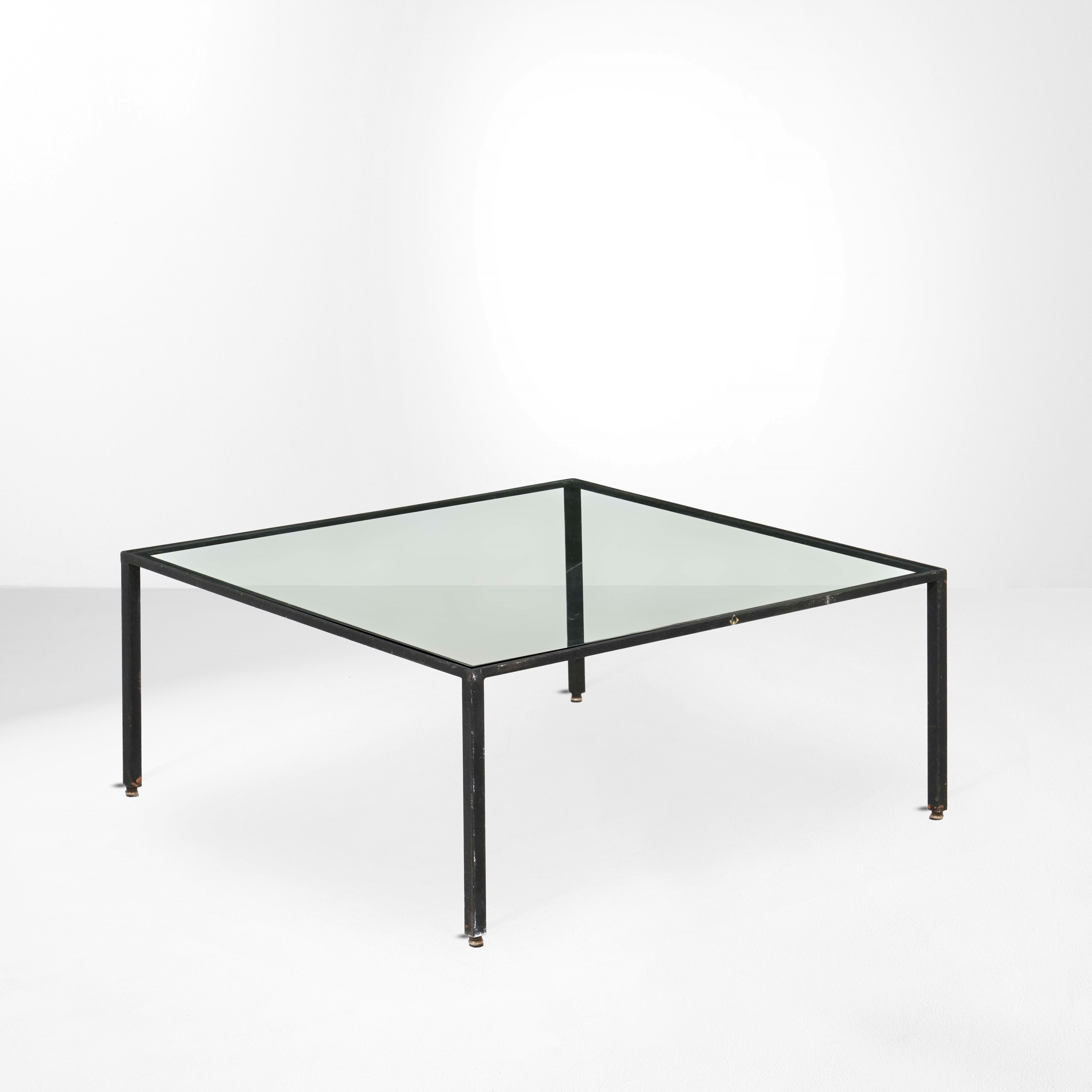 Struttura in metallo laccato, piano in vetro e puntagli in ottone.