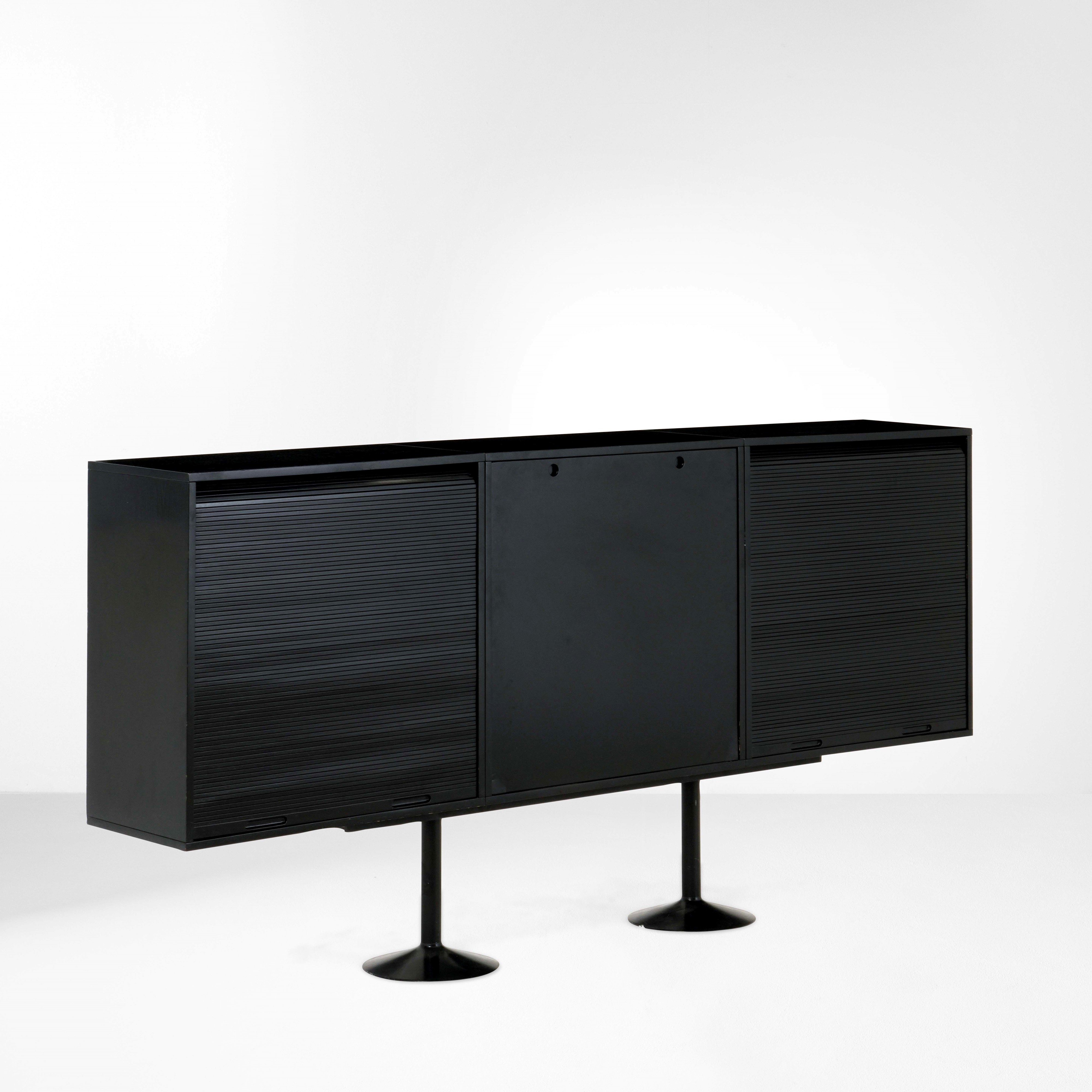 Struttura in legno ebanizzato e sostegni in metallo laccato.