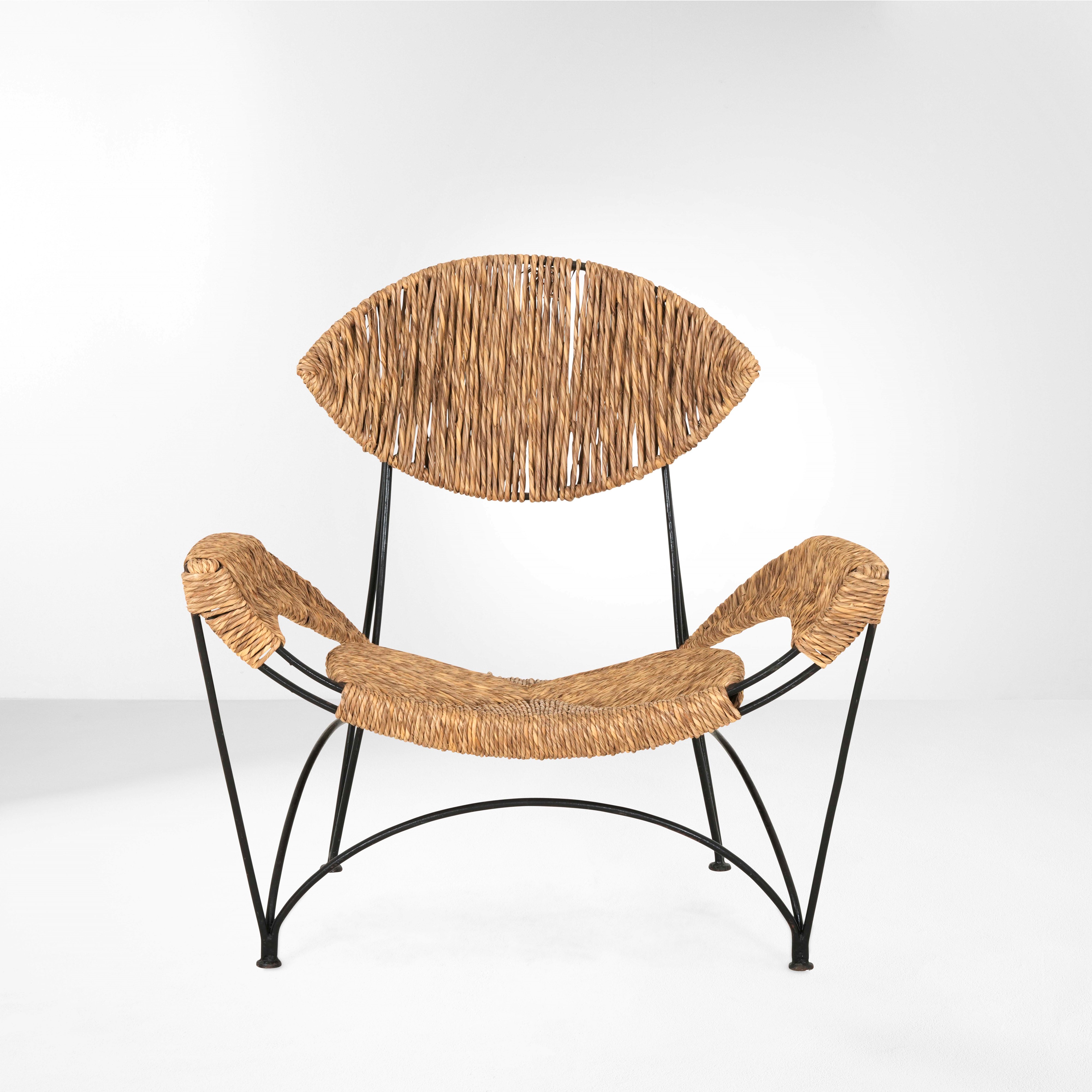 Struttura in metallo tubolare laccato, sedile e schienale in rattan intrecciato.