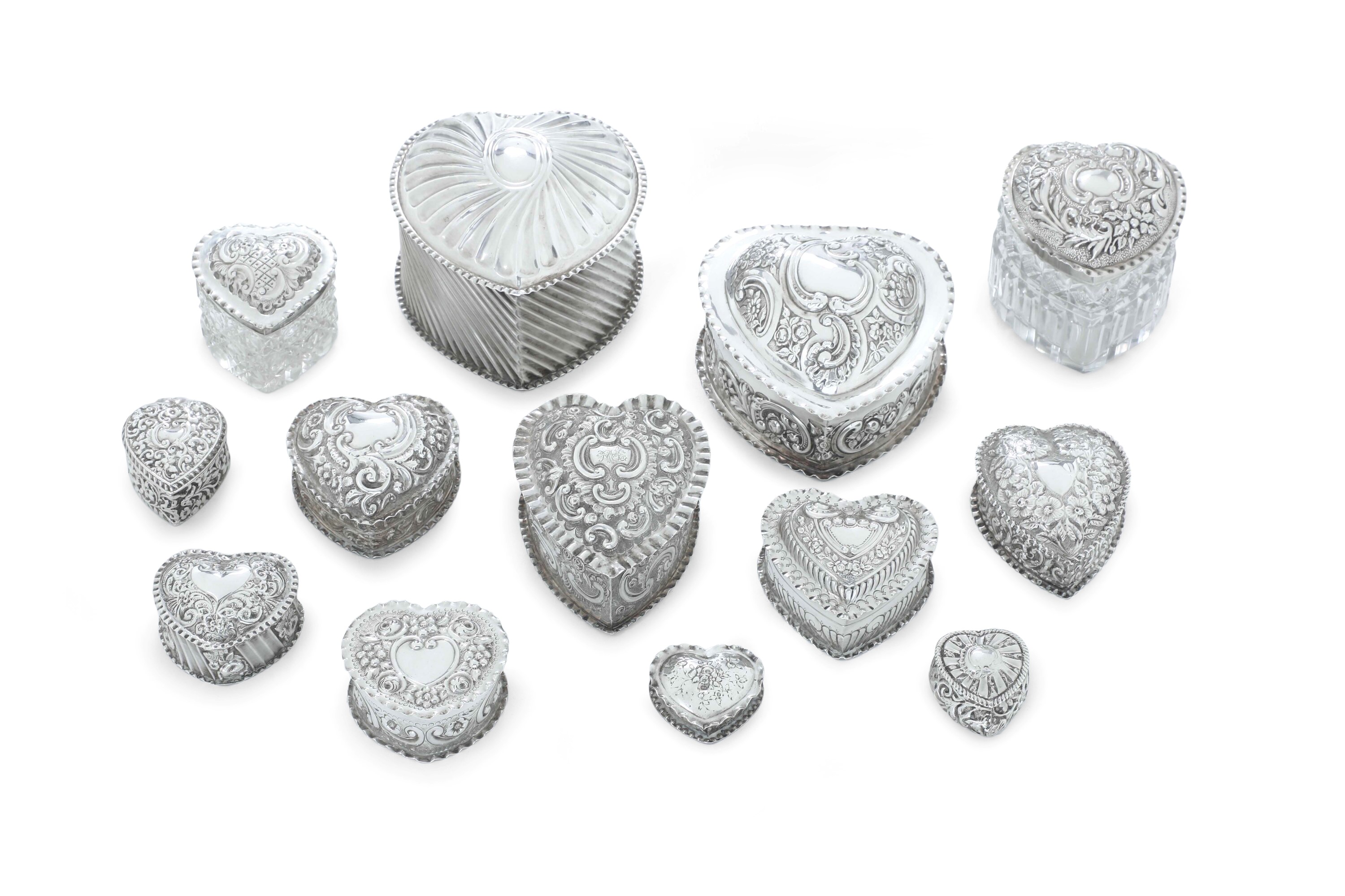 Insieme di 13 scatoline a cuore. Inghilterra XIX-XX secolo, varie manifatture