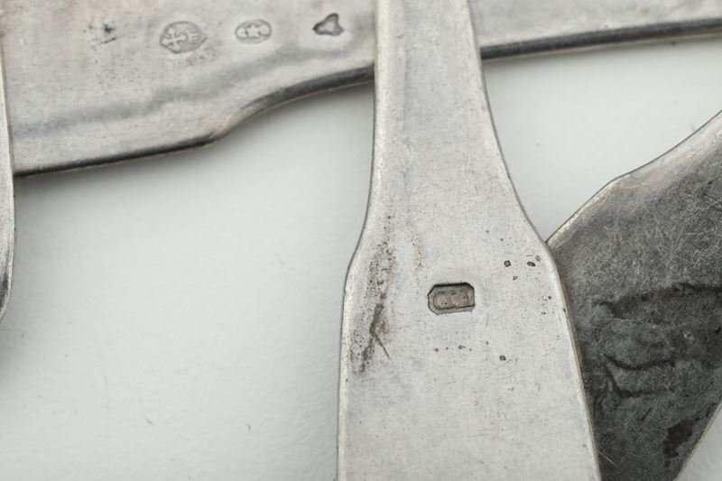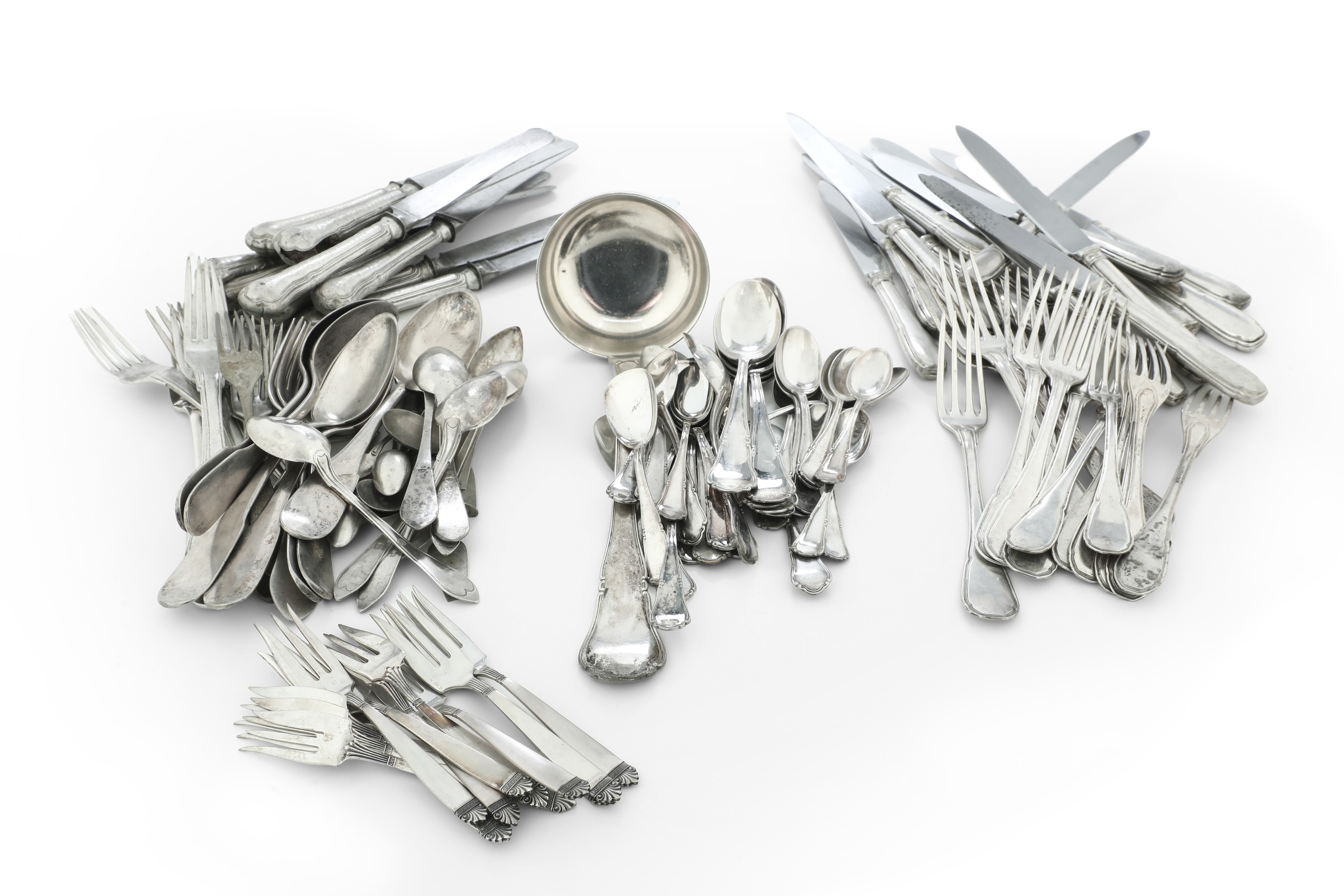 tra cui un mestolo, 6 cucchiai da dessert, 5 cucchiaini da tè, 6 da caffè e 12 palette da gelato della stessa manifattura, 12 forchettine da dessert, 8 forchette grandi, 7 da frutta, 9 coltelli grandi e e 7 da frutta della stessa manifattura ed altre forchette, cucchiai, coltelli e cucchiaini di misure e manifatture diverse tra loro
