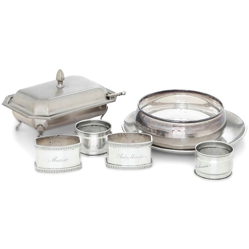 Lotto composto da piattino, coppetta, formaggiera e quattro portatovaglioli. Differenti manifatture italiane del XX secolo