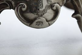 Corpo ovoidale sagomato a volute e incisione con stemma araldico coronato