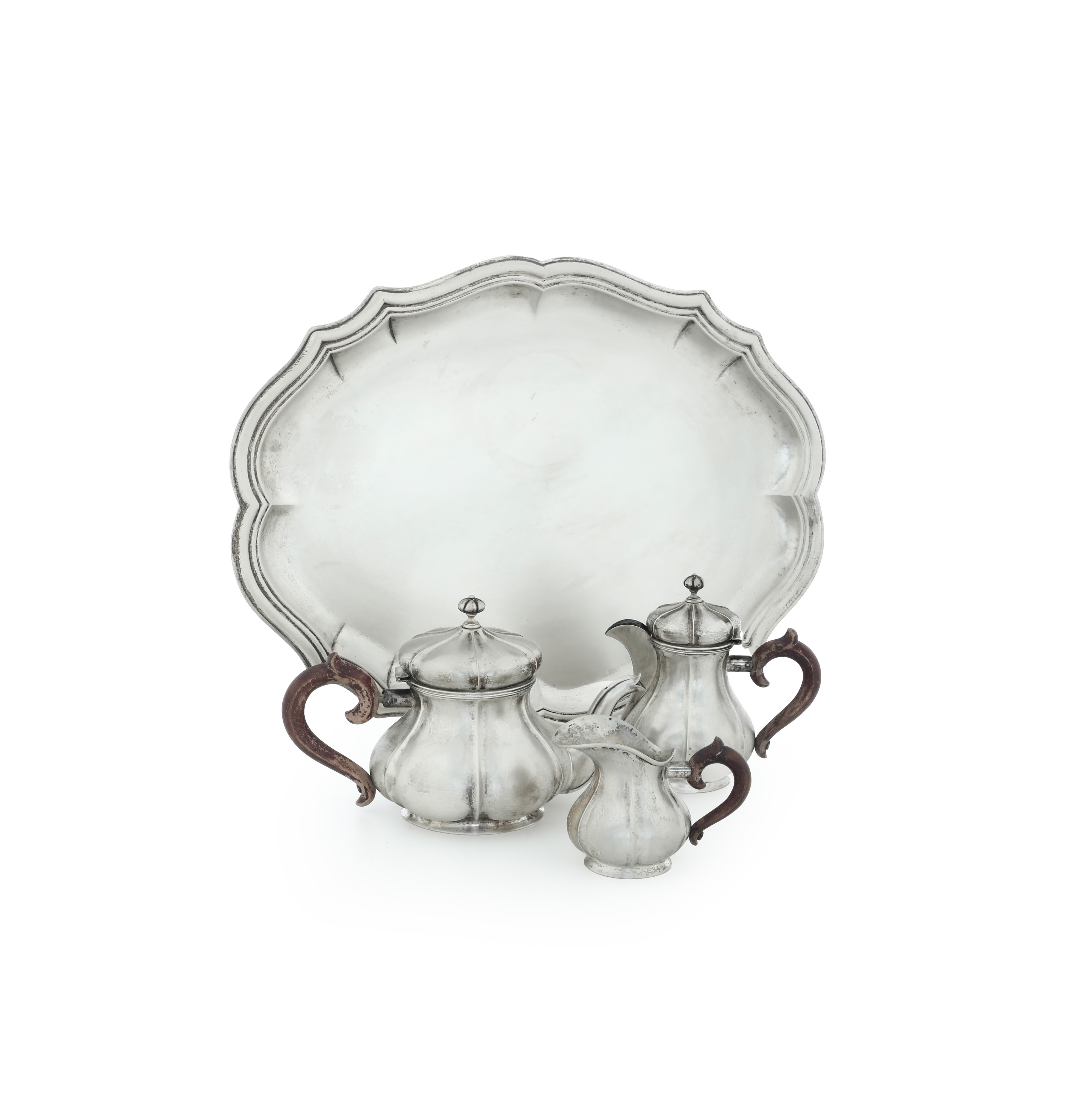 Servizio argento composto da teiera lattiera caffettiera vassoio. Argenteria italiana della prima metà del XX secolo, marchio con fascio littorio in uso dal 1935 al 1945, bollo dell'argentiere consunto