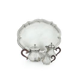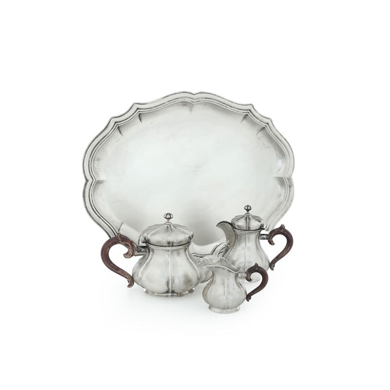 Servizio argento composto da teiera lattiera caffettiera vassoio. Argenteria italiana della prima metà del XX secolo, marchio [..]