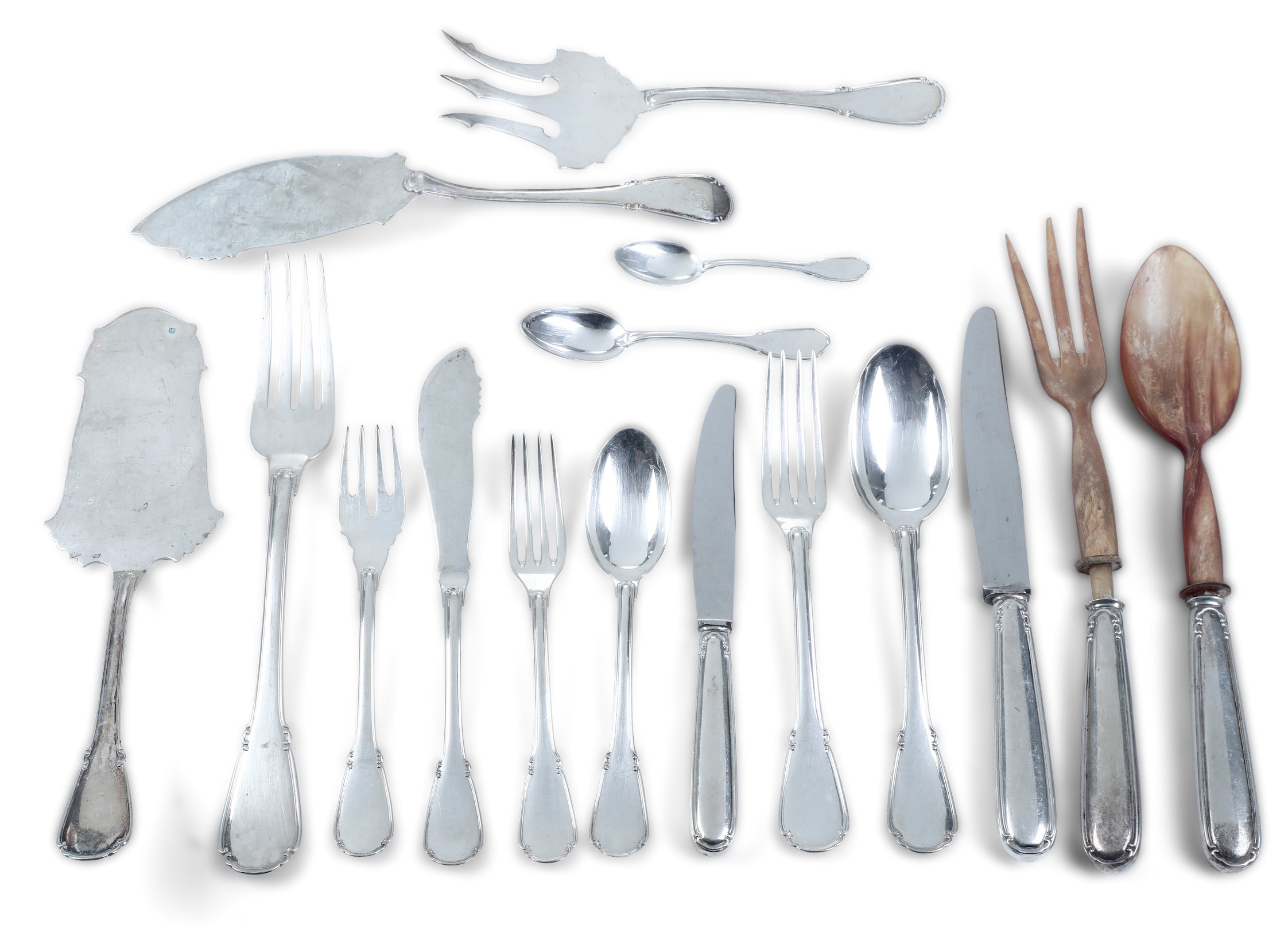 composto da da 12 forchette, 12 coltelli e 12 cucchiai grandi, 12 forchette, 12 coltelli e 12 cucchiai da frutta e dessert, 11 forchette e 12 coltelli da pesce, 8 cucchiaini da tè e 12 da caffè, 6 posate da portata