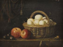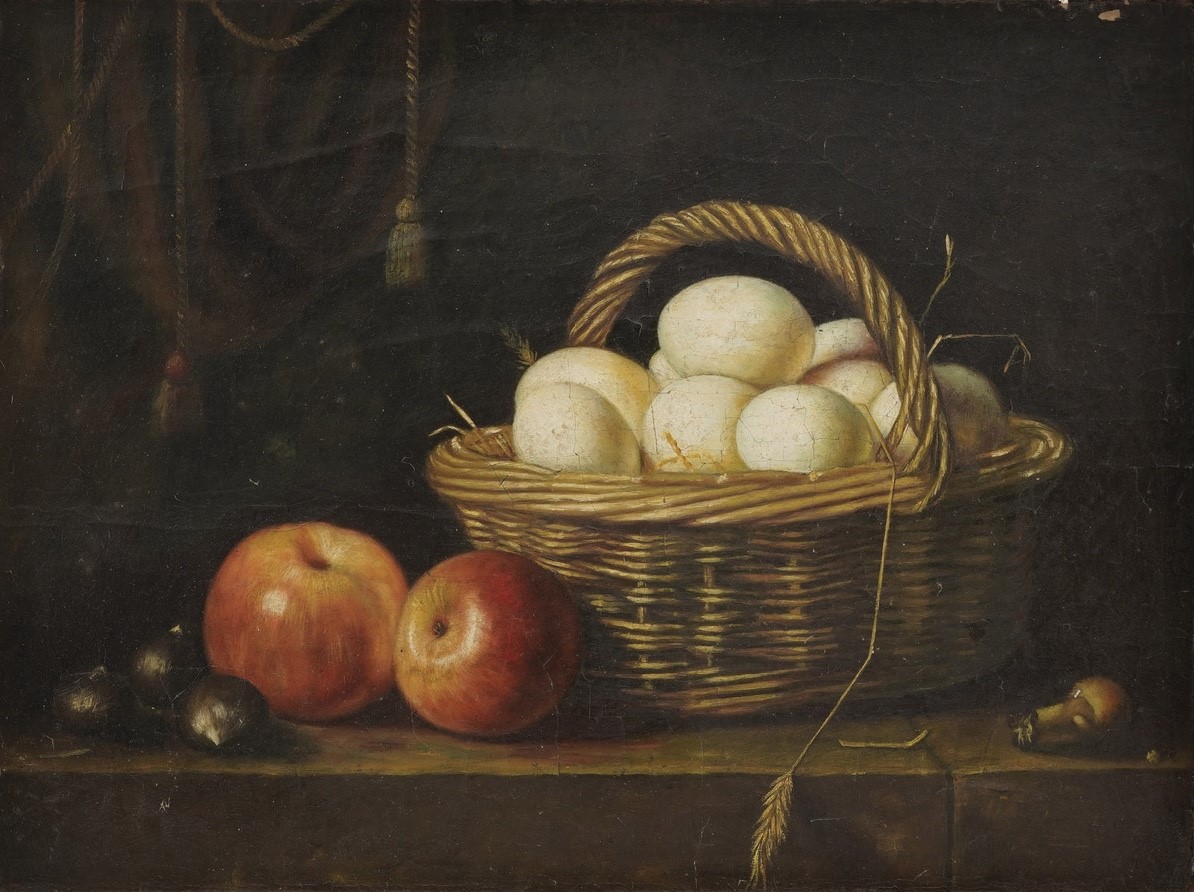 Scuola del XIX-XX secolo Natura morta con mele e cesto di uova