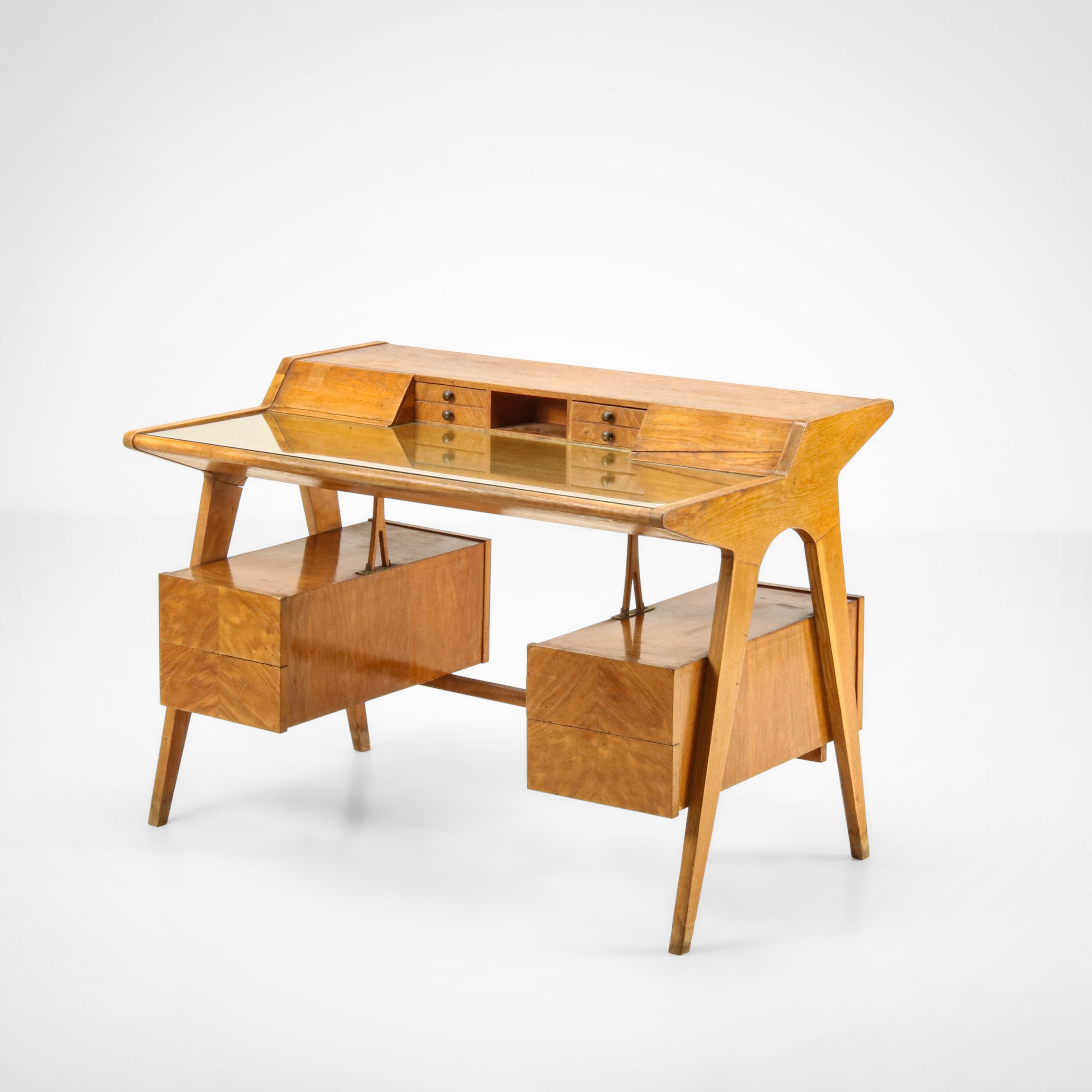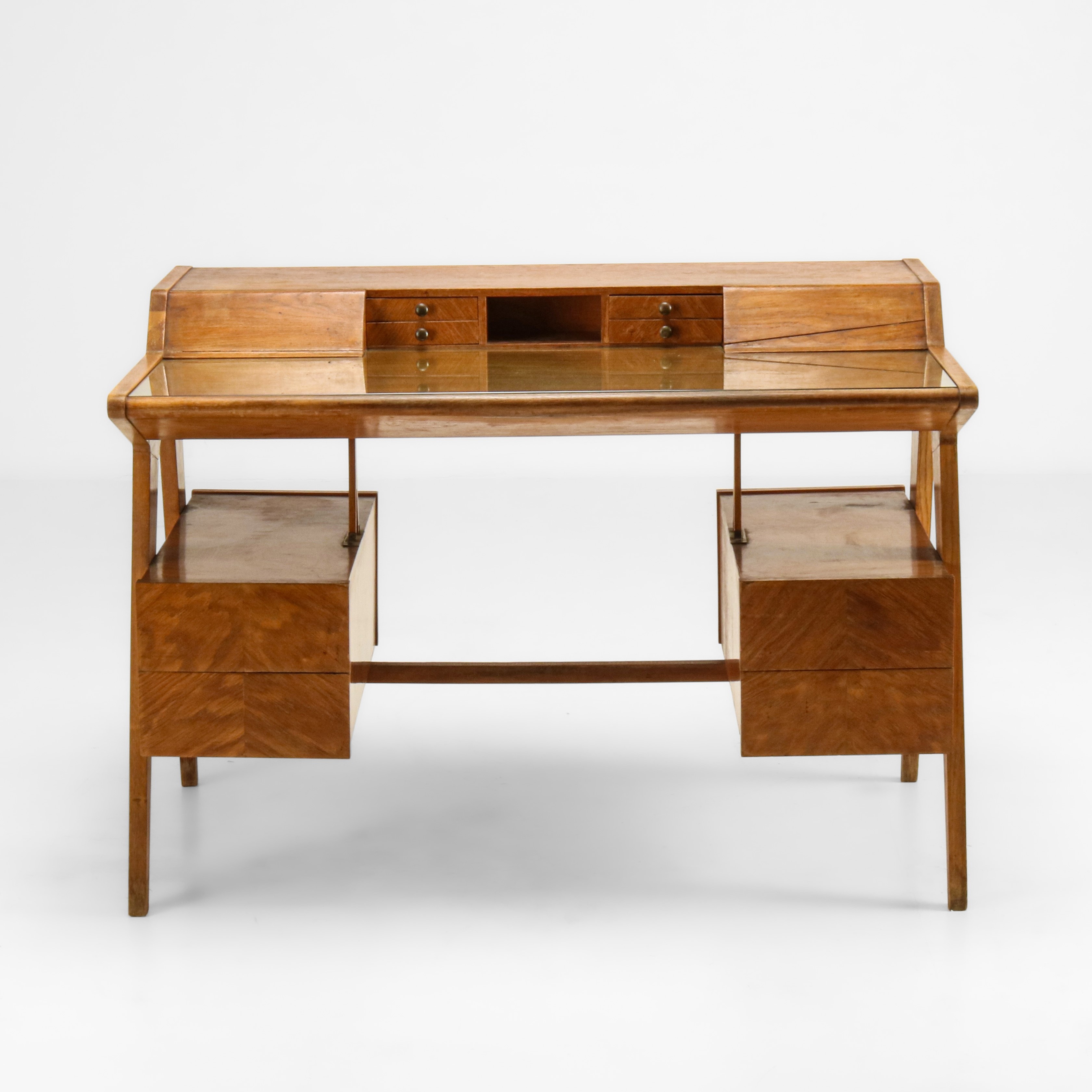 Struttura in legno con piano in vetro e dettagli in ottone.