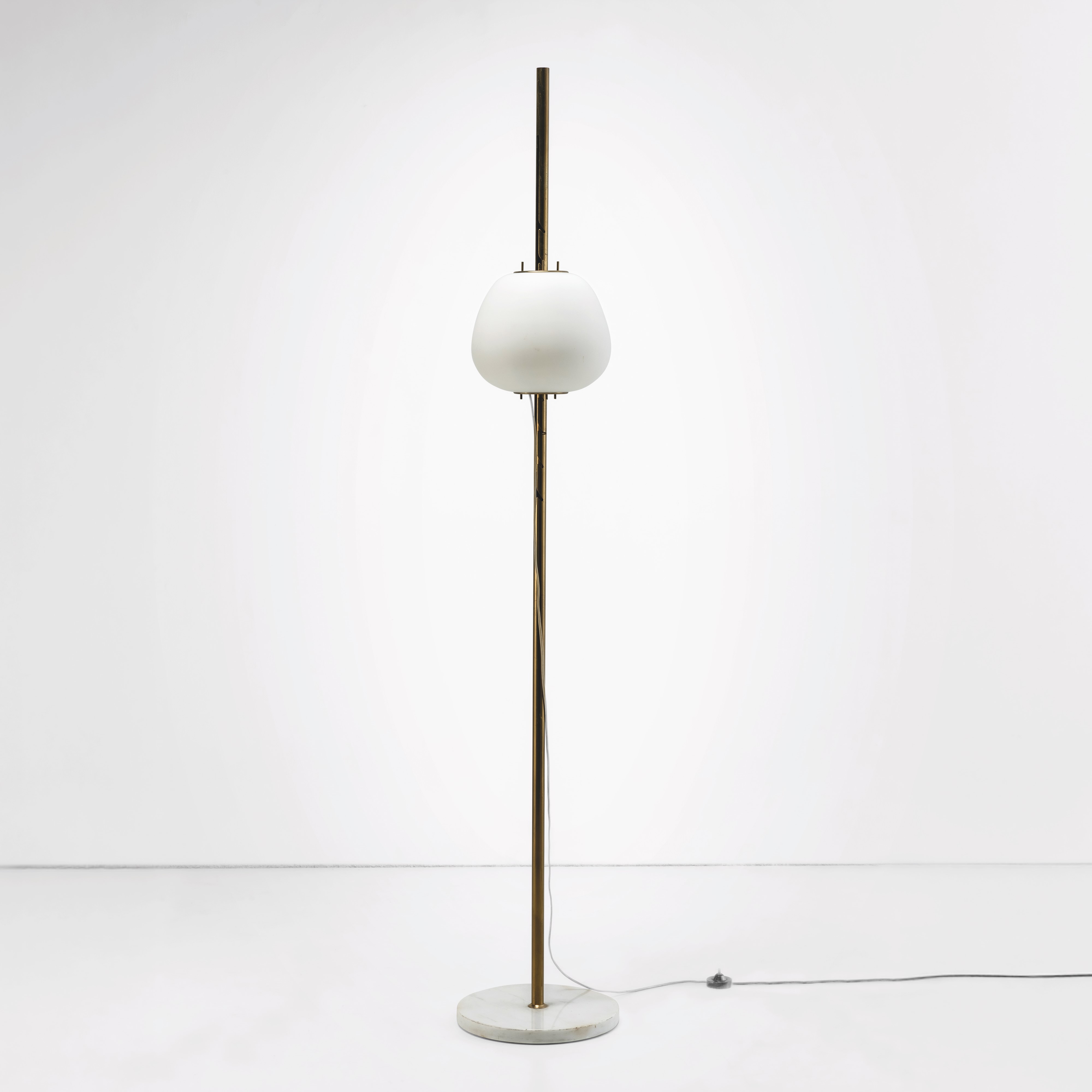 Struttura in ottone, base in marmo e diffusore in vetro duplex opal bianco.