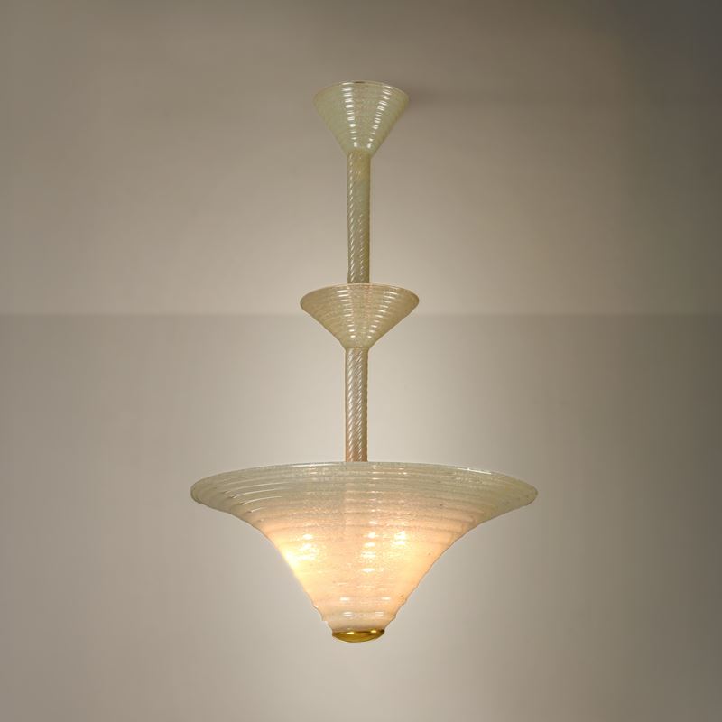 Struttura in metallo e ottone. Elementi del fusto e coppe in vetro di Murano a bollicine.