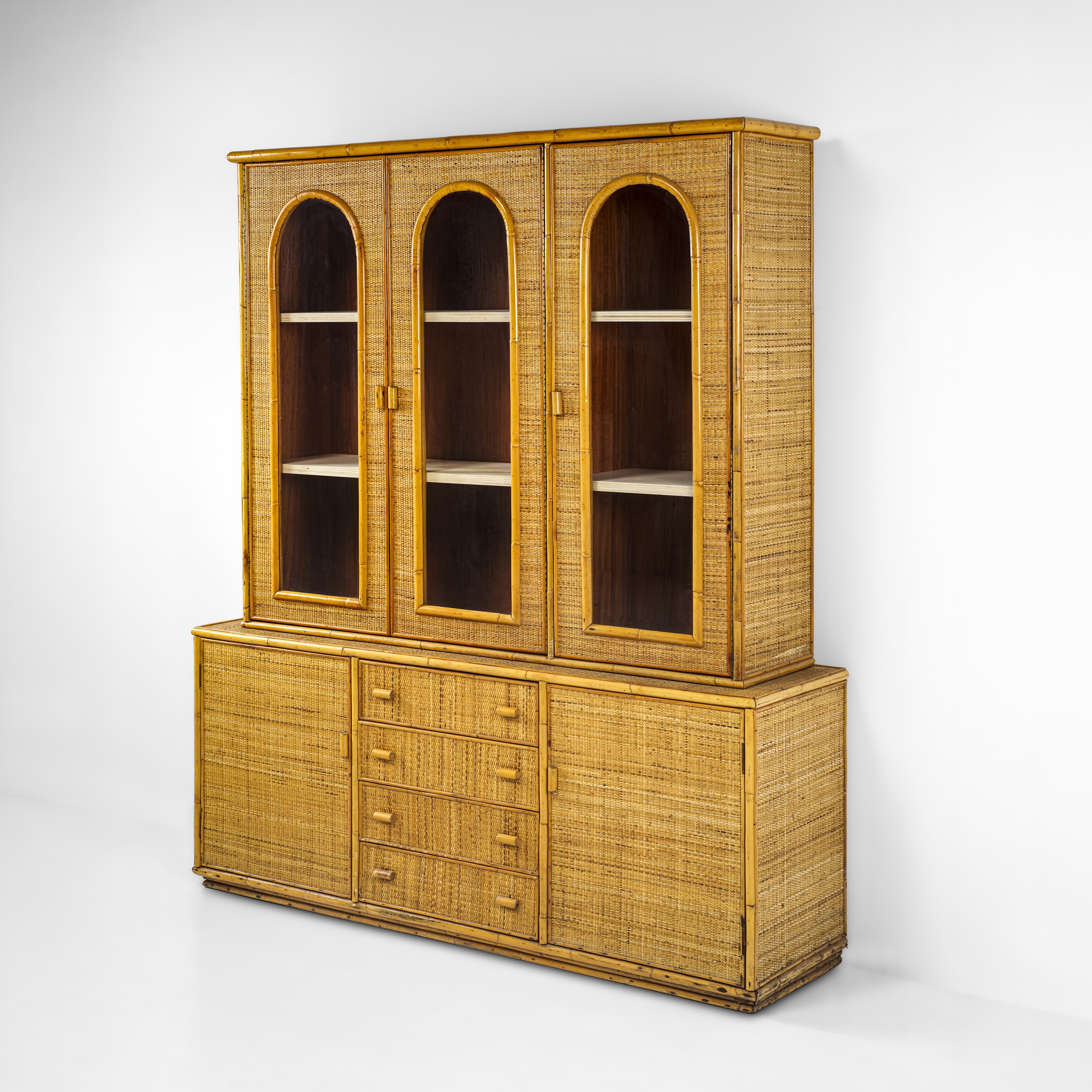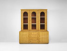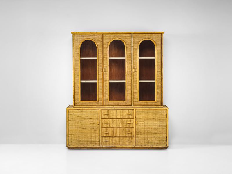 Struttura in legno e bambù con rivestimenti in giunco. Dettagli in ottone. Ante in vetro.