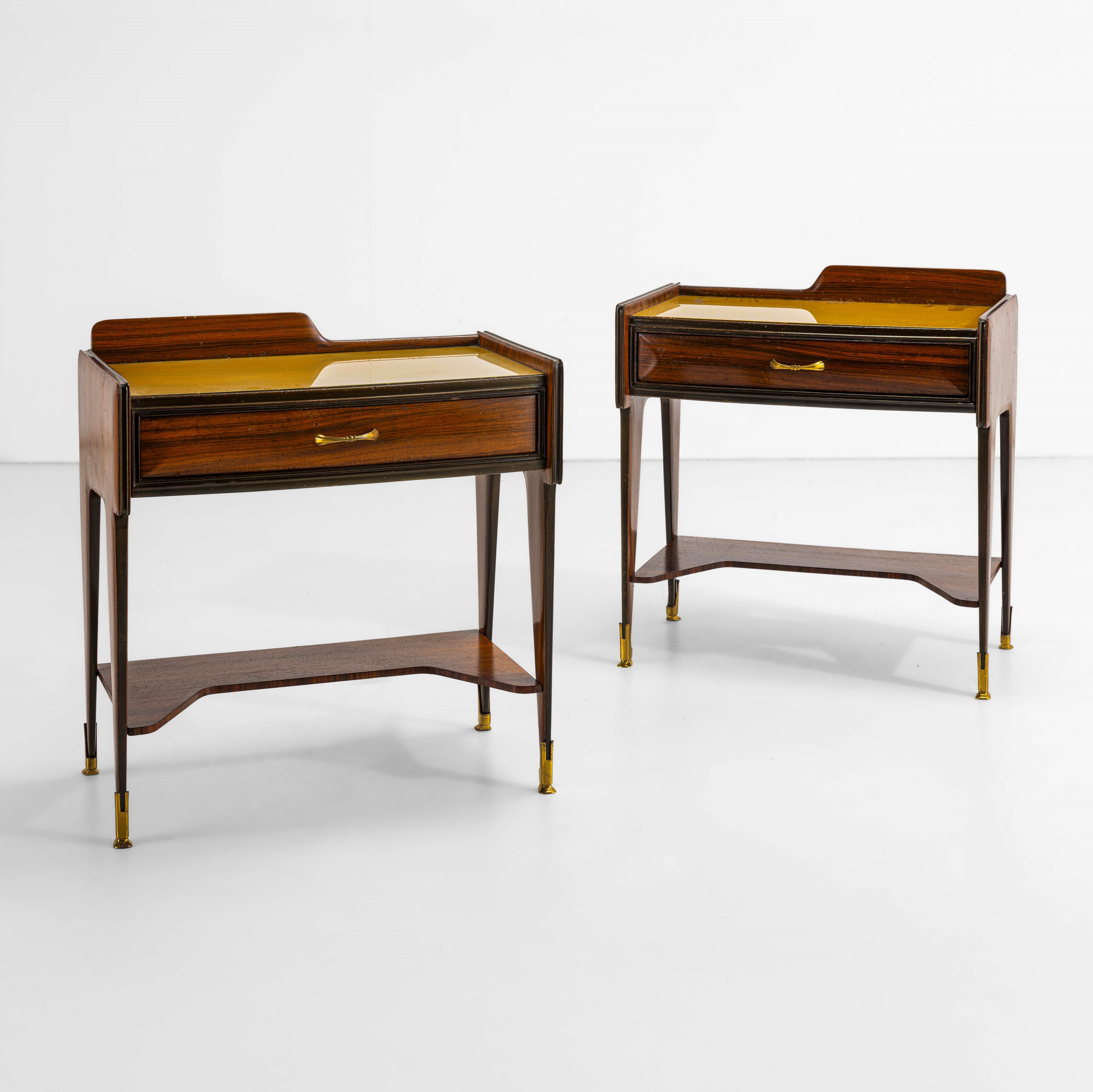 Struttura in legno e legno laccato. Ripiani in vetro. Dettagli in ottone.