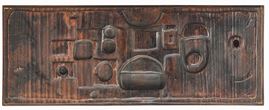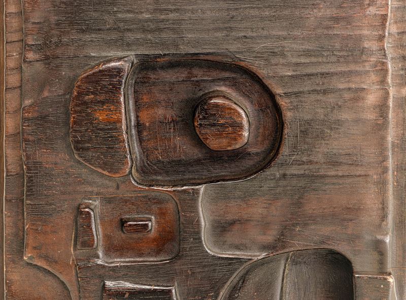 Struttura in legno pirografato a bassorilievo.