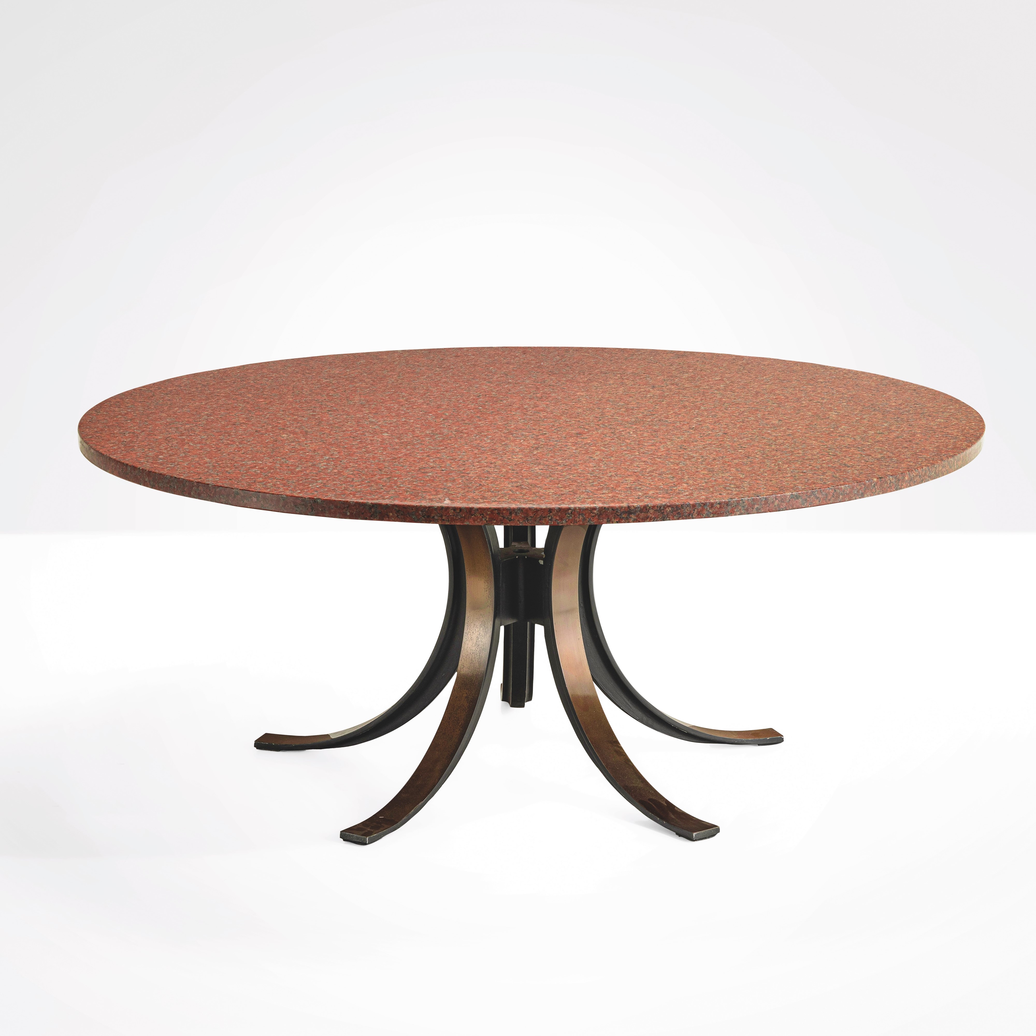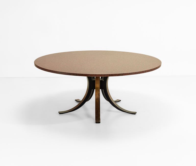 Struttura in fusione di alluminio verniciato e ottone bronzato, piano in marmo.