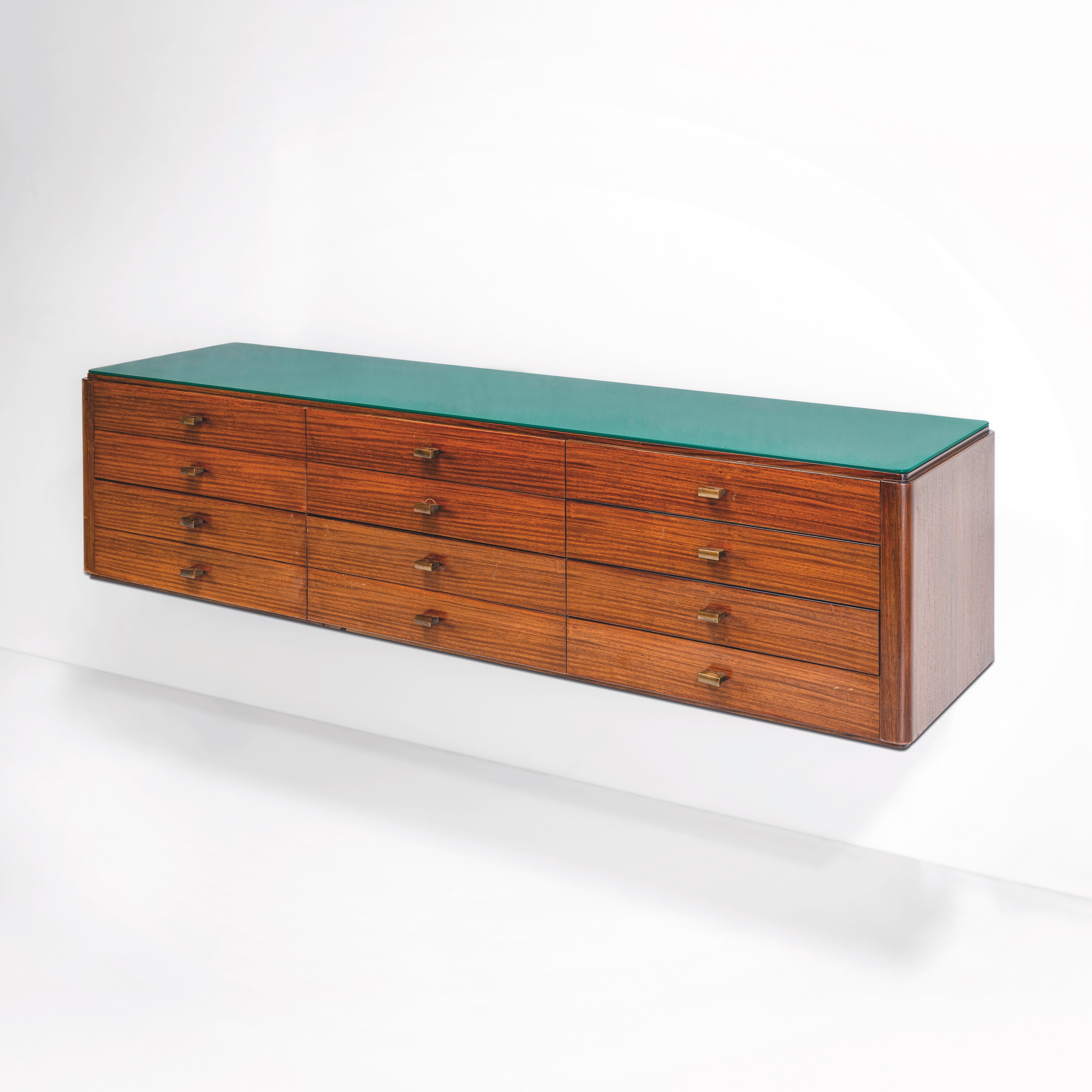 Struttura in legno con piano in vetro e maniglie in ottone.