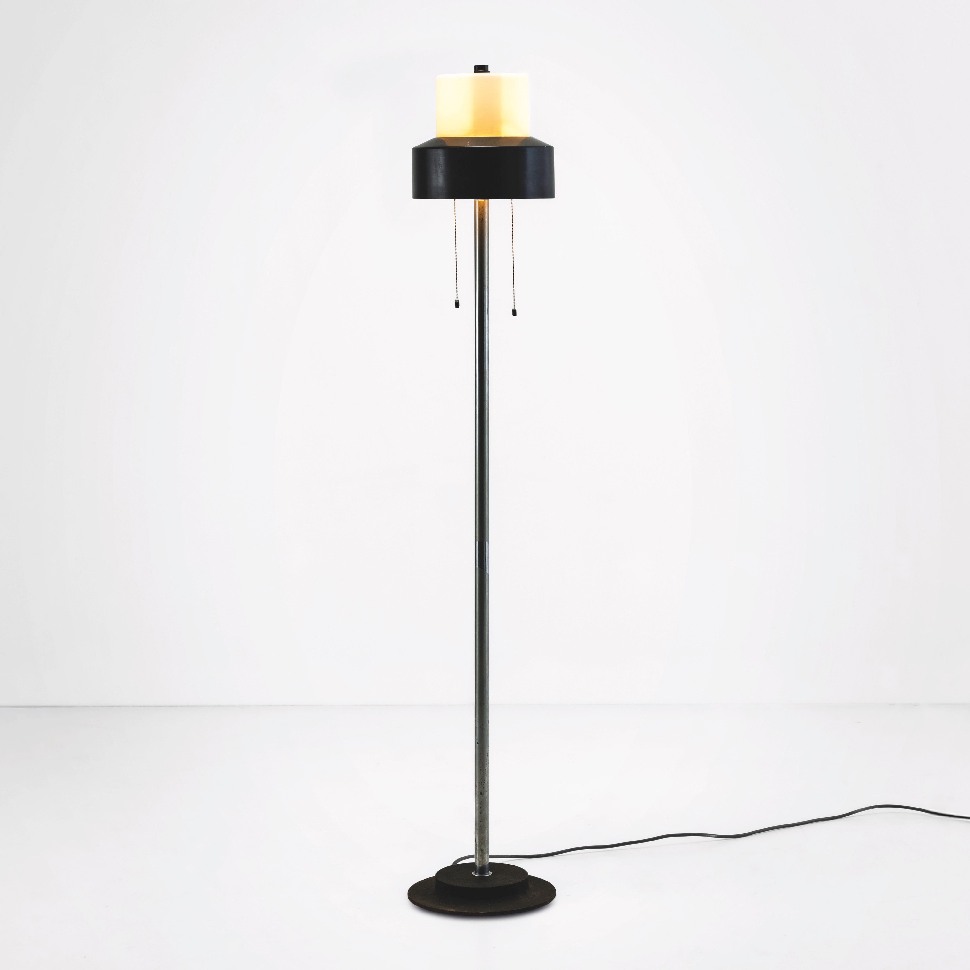 Struttura in metallo cromato e metallo laccato. Diffusore in metallo e vetro satinato. Base in ghisa.