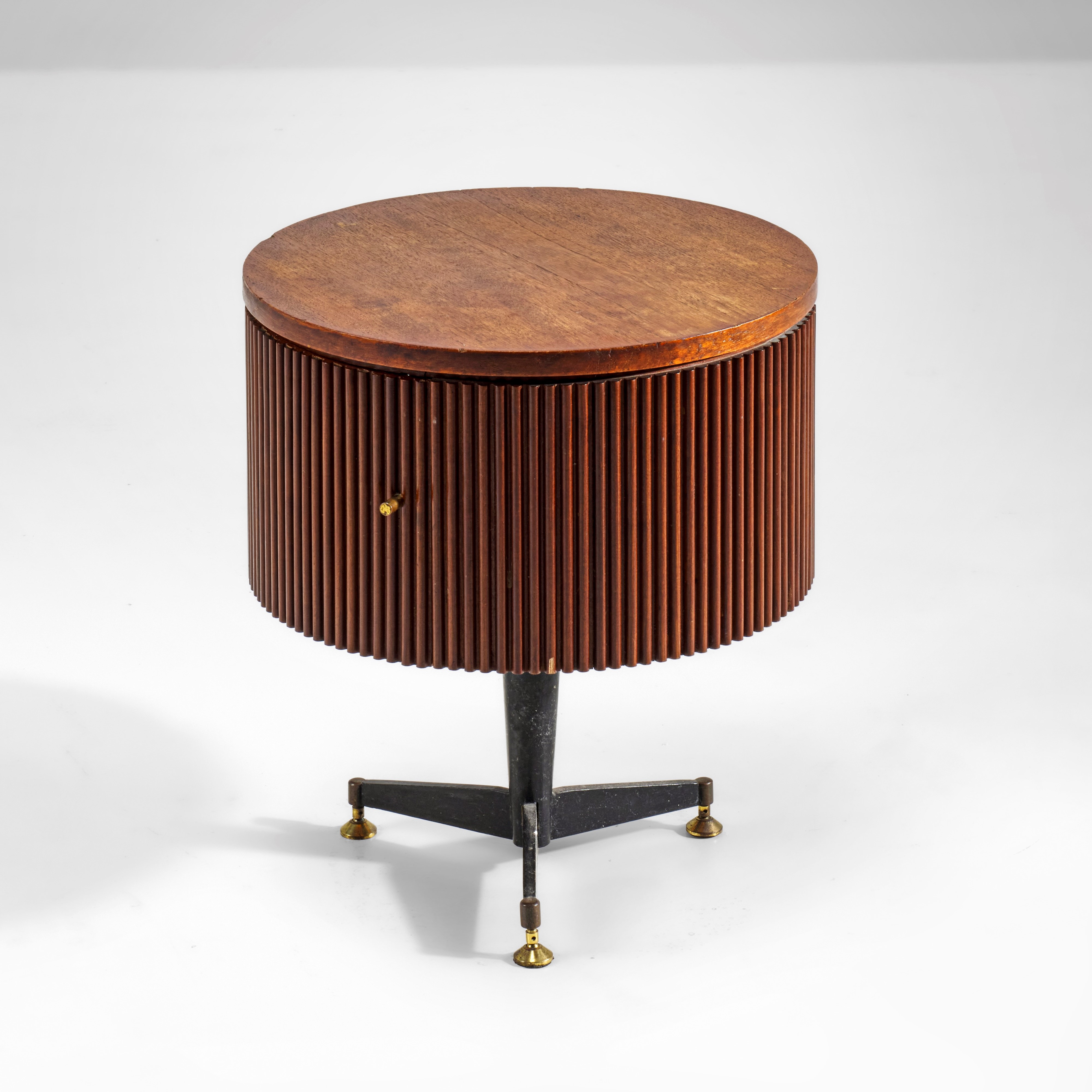 Struttura in legno impiallacciato e grissinato. Sostegni in metallo laccato con puntali e pomello in ottone.
