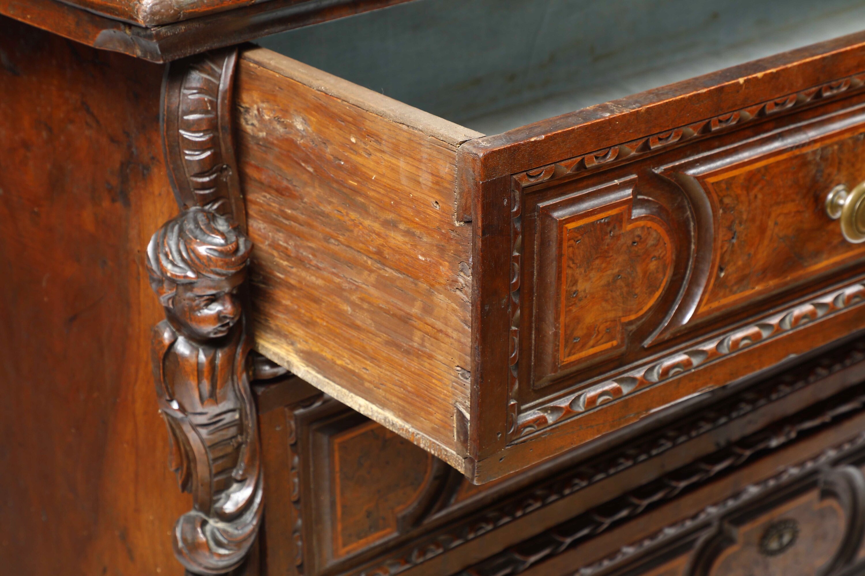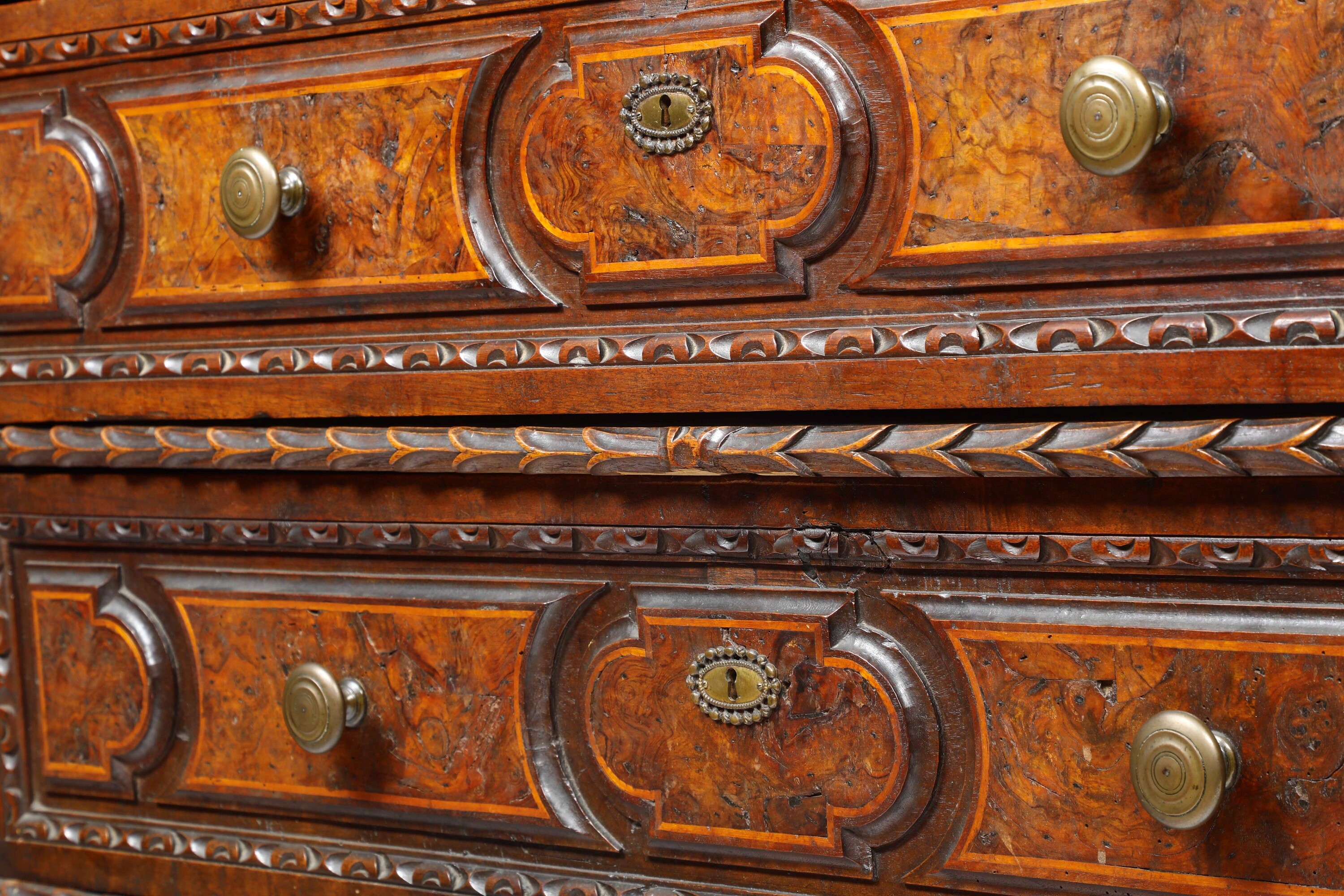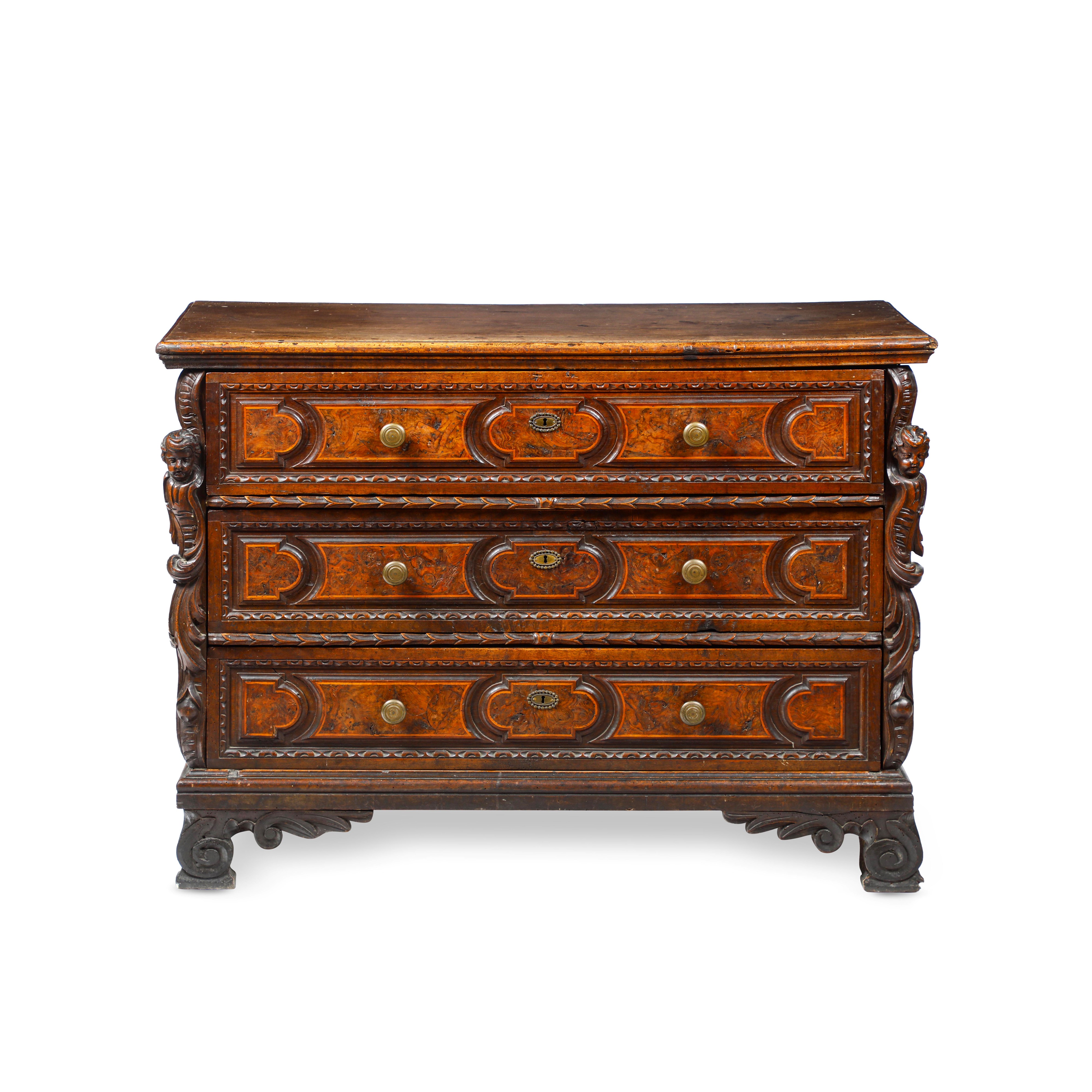 Fronte a tre cassetti pannellati e lastronati in radica con bordo intagliato a foglie, montanti angolari scolpiti a volute e putti, piedi a volute (difetti e restauri)